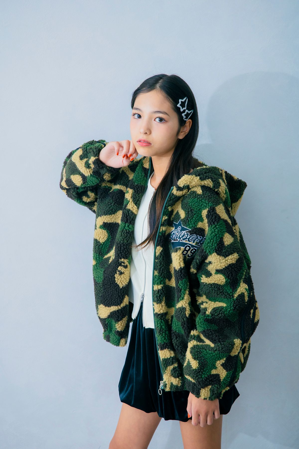 周りと被りたくないこは、迷彩柄で楽々お目立ち! ブラックのミニスカでギャルにふってみて。ルナ☆ボアブルゾン¥5490/ビスキー ジップトップス¥1990/ジーユー スカート¥4990/GapKids ※一部店舗限定 ヘアピンセット¥385/U(ユー)