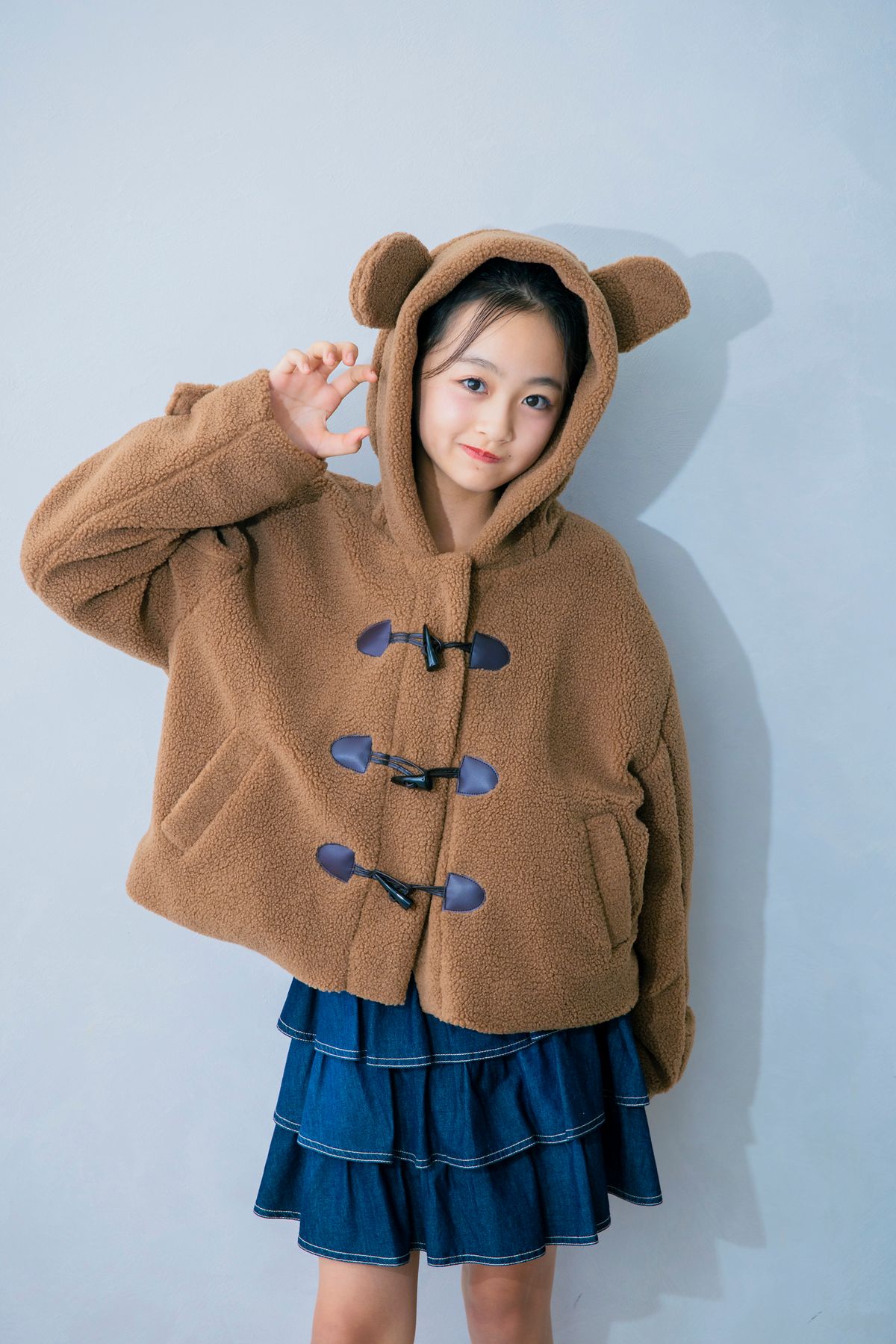 ダッフルコートはブラウンが大定番。くま耳つきのデザインが、甘さもあってコーディネイトがキュートに仕上がるよ。カエデ☆ボアダッフルコート¥10890/バイ ラビット スカート¥16390/メゾ ピアノ ジュニア