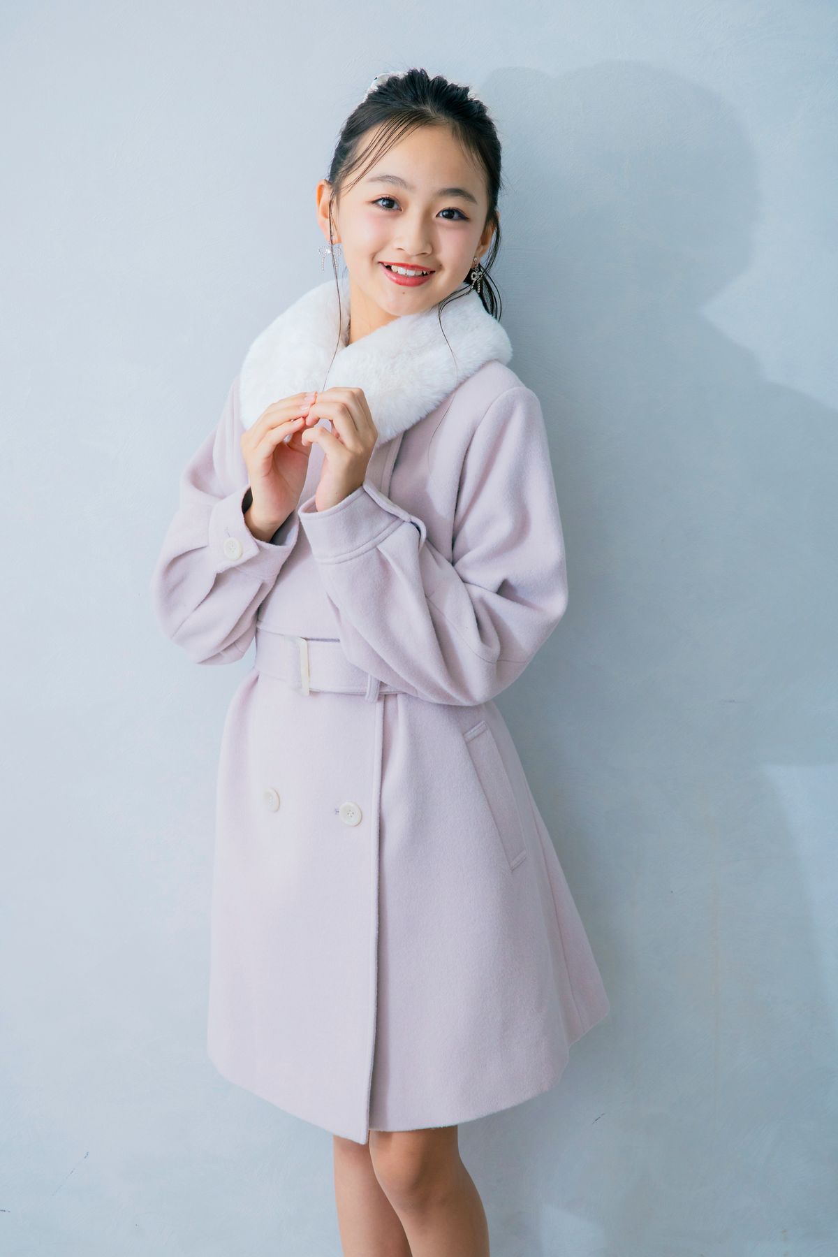 柔らかいピンクで甘せいそなお嬢様コートは、特別な日に大活躍。エリのファーもお上品で最高! カエデ☆ファー襟つきAラインコート¥47300/メゾ ピアノ ジュニア シュシュ¥880/U(ユー)