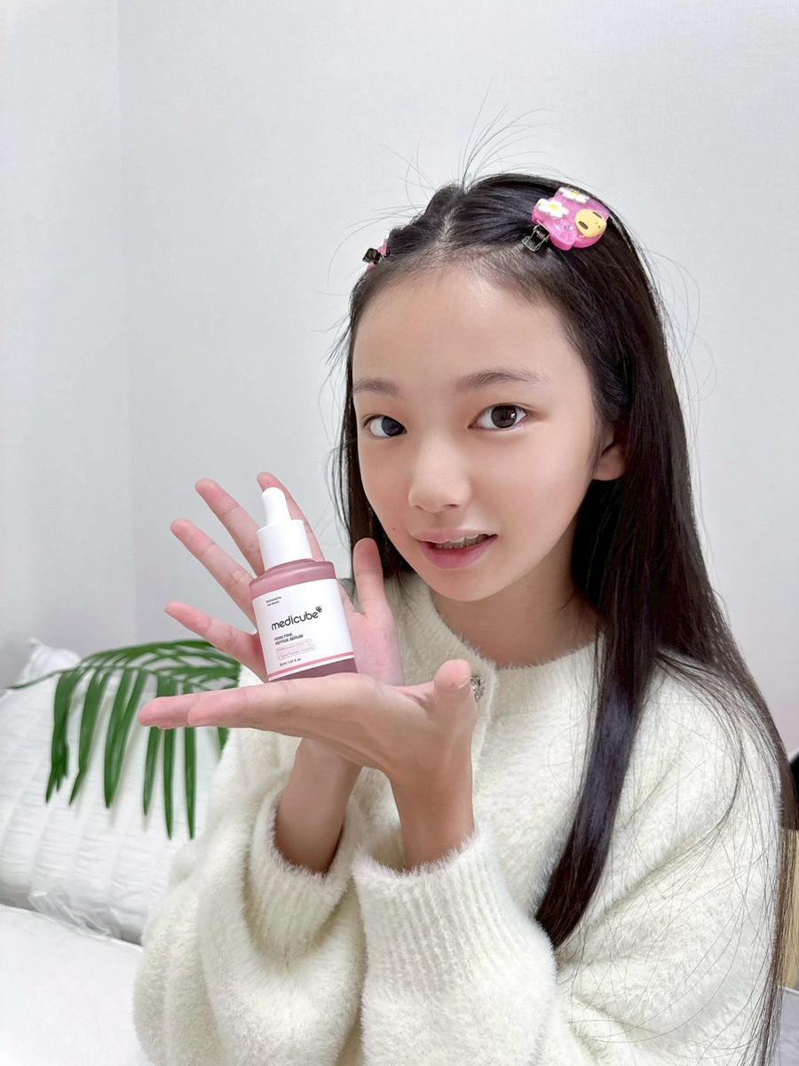 洗顔や化粧水🧴などで整えた後には、今オススメの美容液をしっかりしんとうさせるよ🧴💦中身はピンクでピンクの成分がお肌をツヤツヤモチモチにしてくれるらしい👩✨(ママと一緒に使ってるよ)