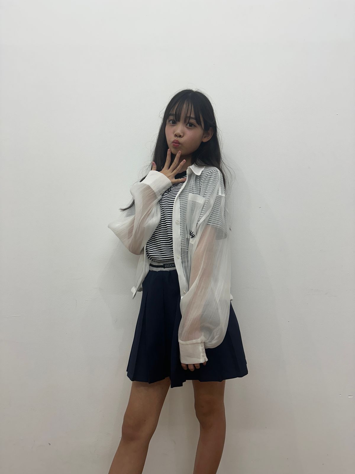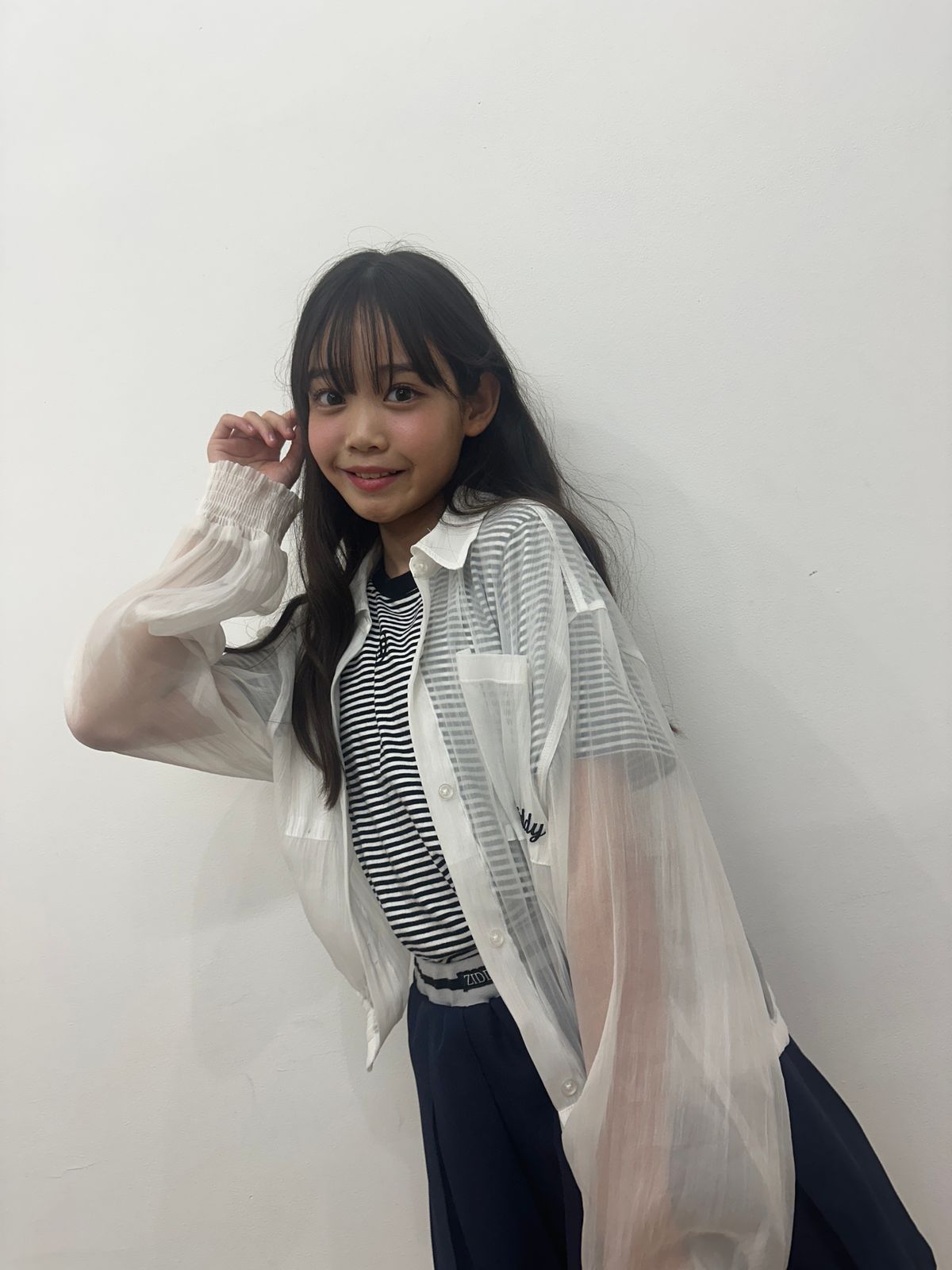 モノトーンにまとめて、最高学年らしい6年生のお姉さんルックの完成! ホワイトのシースルーの羽織りは、コーデを上品にまとめてくれて優秀。