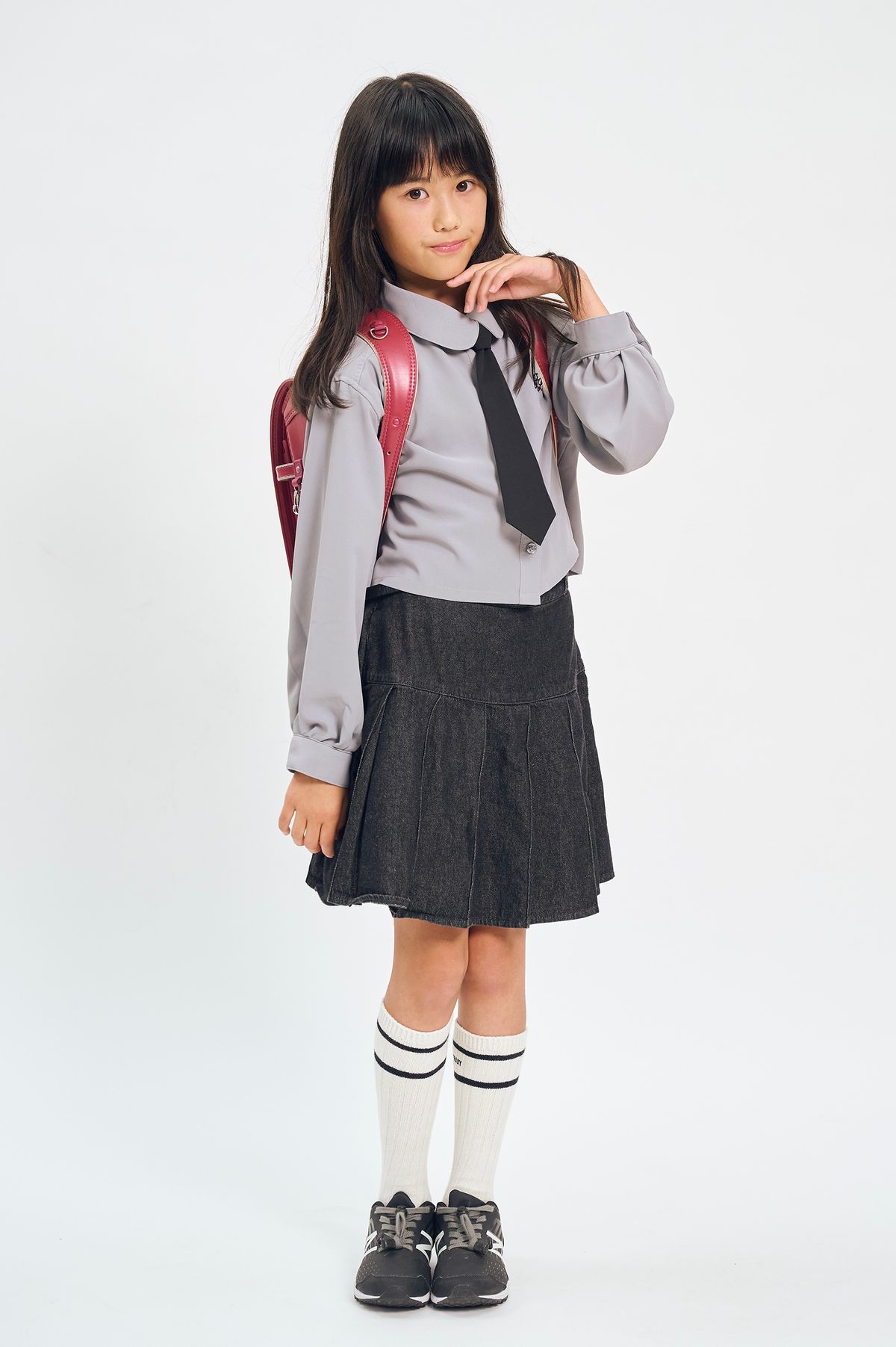 ネクタイをつけてまじめキャラをえんしゅつ。プリーツデニムシャツでちょっぴりかわいさも残してね。