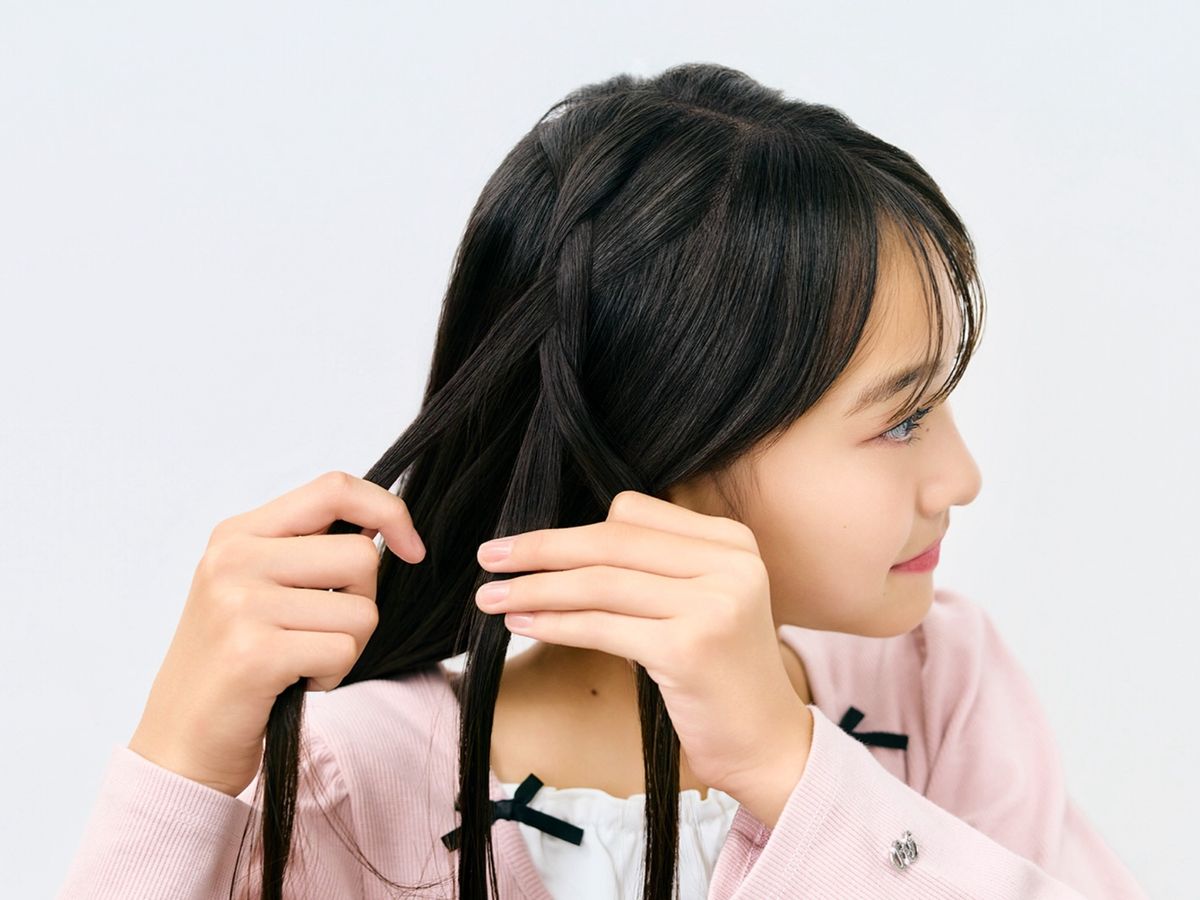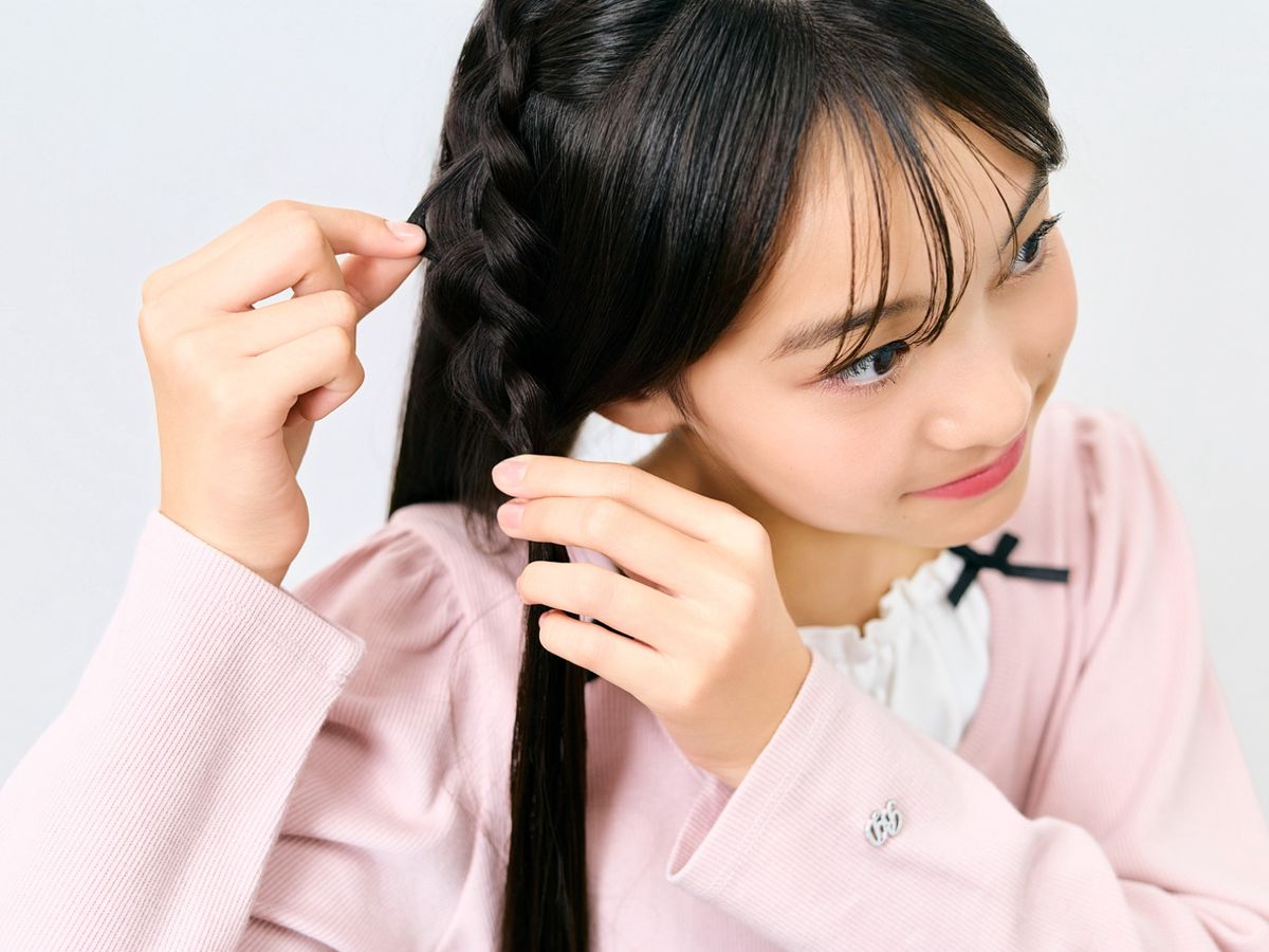 ②①で分けた3つの毛束をみつあみしていく。あみ目が多い分、むずかしそうに見えてめちゃかわ♪