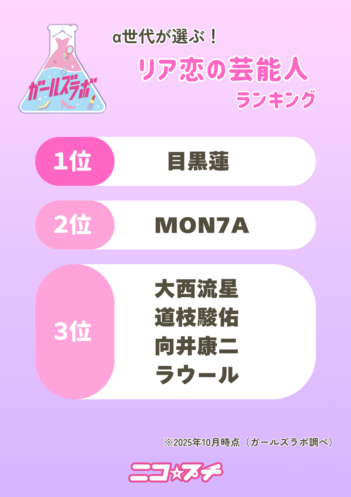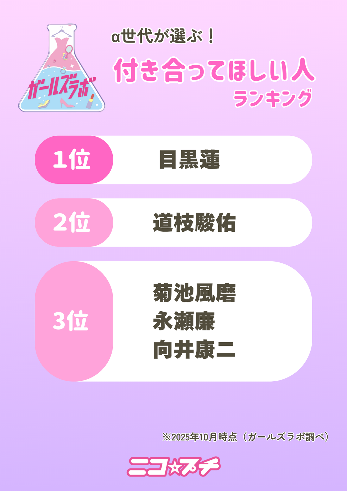 SnowManの目黒蓮さん向井康二さん、なにわ男子の道枝駿佑さんが「リア恋」ランキングに続いてランクイン。「リア恋の芸能人」と「好きな芸能人」では少し違うみたい!