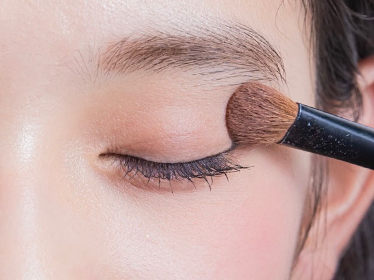 ①アイホール全体に、うすいピンクとブラウンをまぜてのばす。