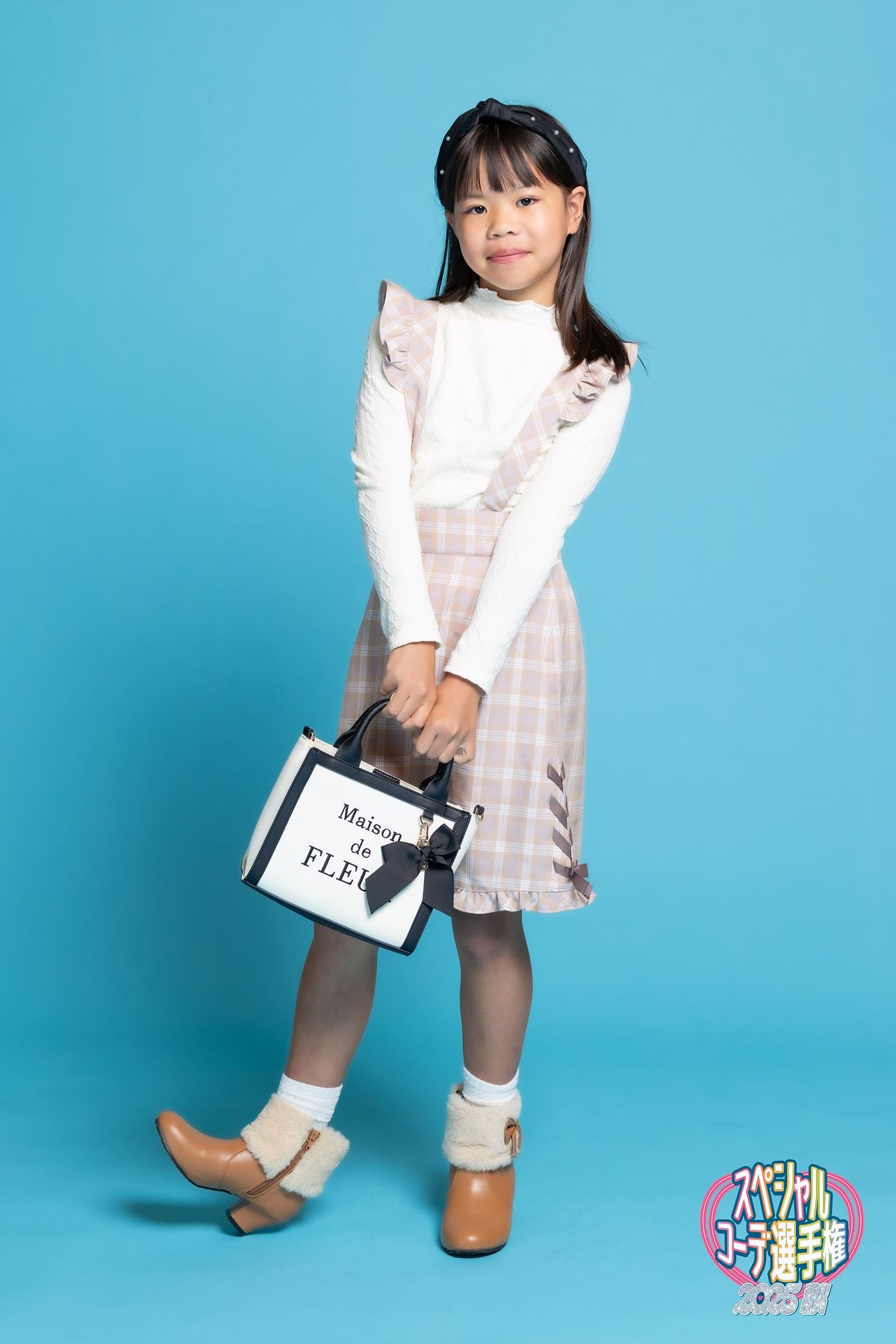 甘いピンクのチェックスカートに、ブラウンのブーツで秋らしく♡ 大人っぽいカチューシャとバッグで仕上げ♪
