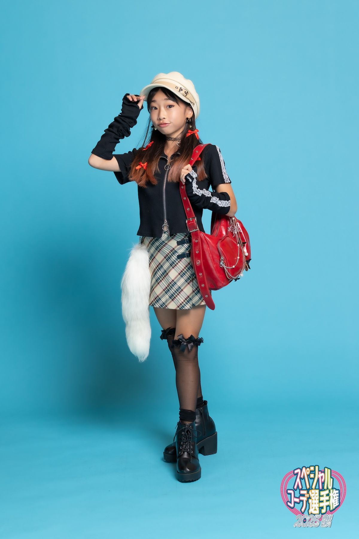 今どきなガーリーコーデにチェックやアームウォーマー、しっぽで平成っぽさをプラス。上級者なミックスコーデ大成功♡