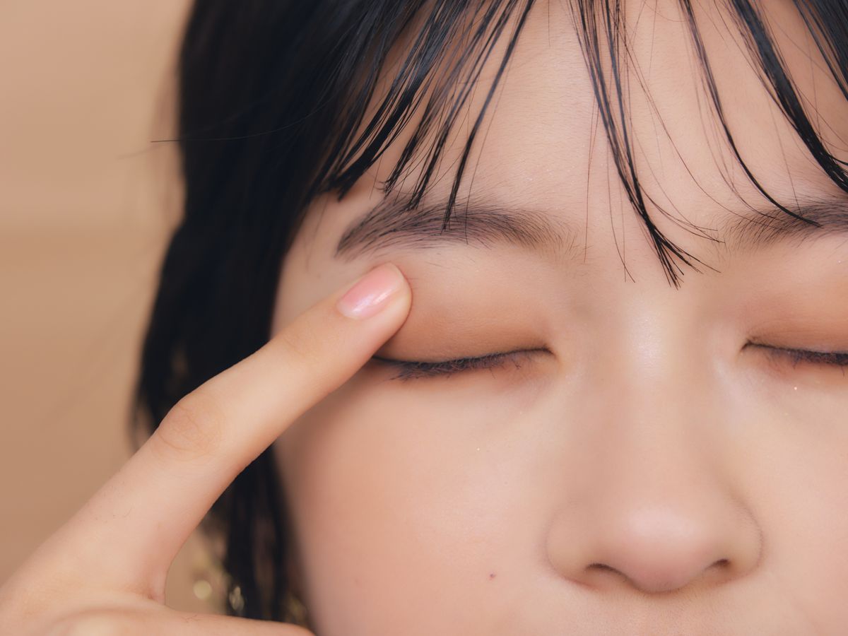 Aの下の段、右から3つ目の色を、アイホールにたっぷりぬって! 涙袋にも入れて、しっかり目をかこむよ。