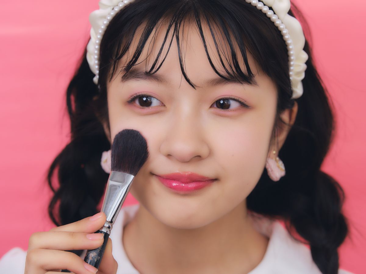 最後にCのチークを4色まんべんなくブラシでとって、ほっぺたにたっぷりイン!