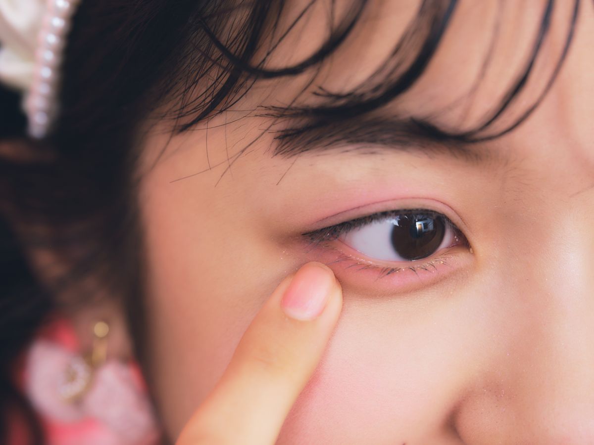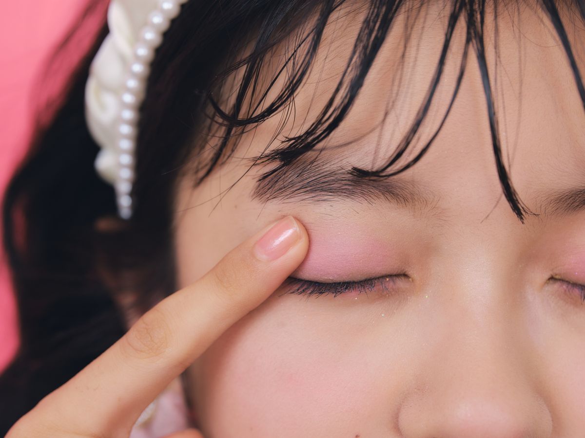 黒目下にも同じピンクを入れて、涙袋の線をかくようにAのアイシャドウの下の段、一番右の色を入れて!
