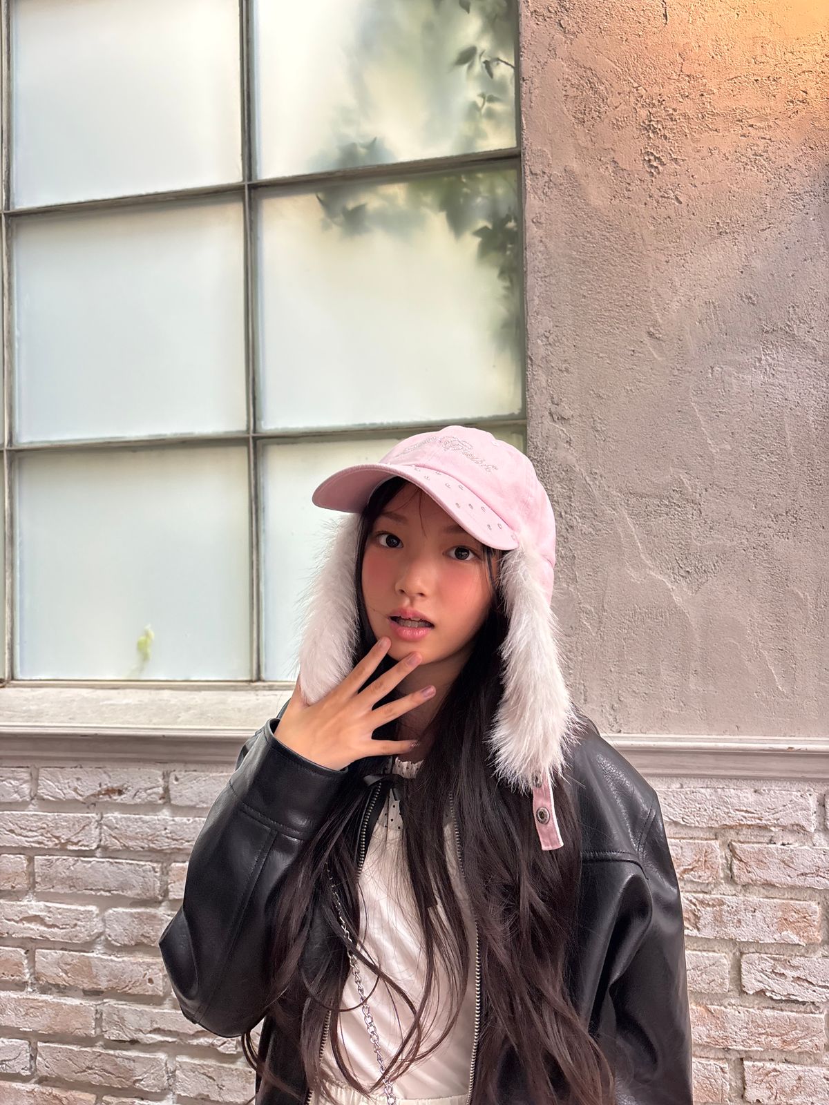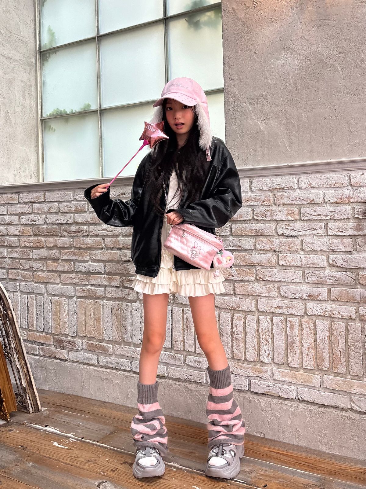 シンプルなモノトーンコーデにお気に入りのピンクアイテムをプラスしたよ! もふもふのキャップはY2Kみが強くてお気に入り。アイテムはそれぞれ甘めだけど、レザージャケットを合わせたら大人っぽくなる♡