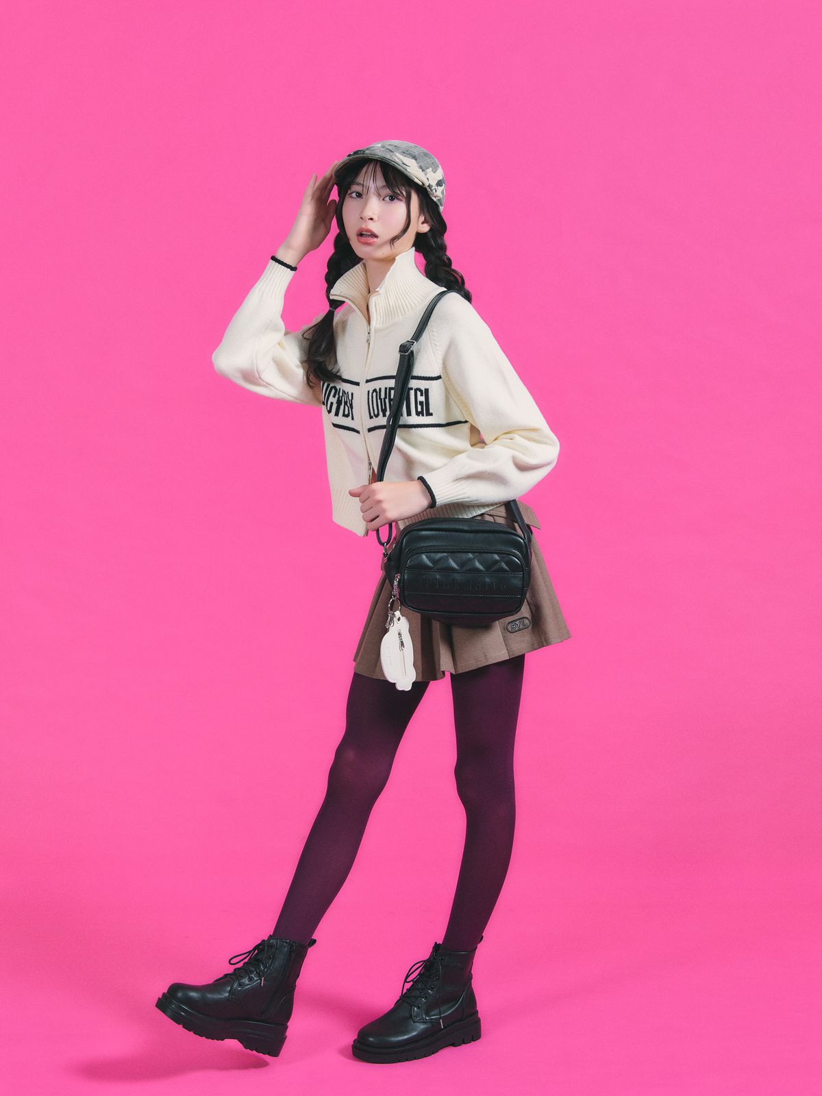季節感たっぷりのボルドータイツで、カジュアルコーデをかく上げ! 実はどんなテイストとも相性のいい万能カラー☆キアラ☆タイツ¥1210/靴下屋(タビオ) カーディガン¥6930、ベルトつきスカート¥6490/ともにバイ ラビット ハンチング¥2090/ギャレッツ渋谷109店 バッグ¥4290/ピンク ラテ チャーム¥3630、シューズ¥16390/ともにポンポネット ジュニア