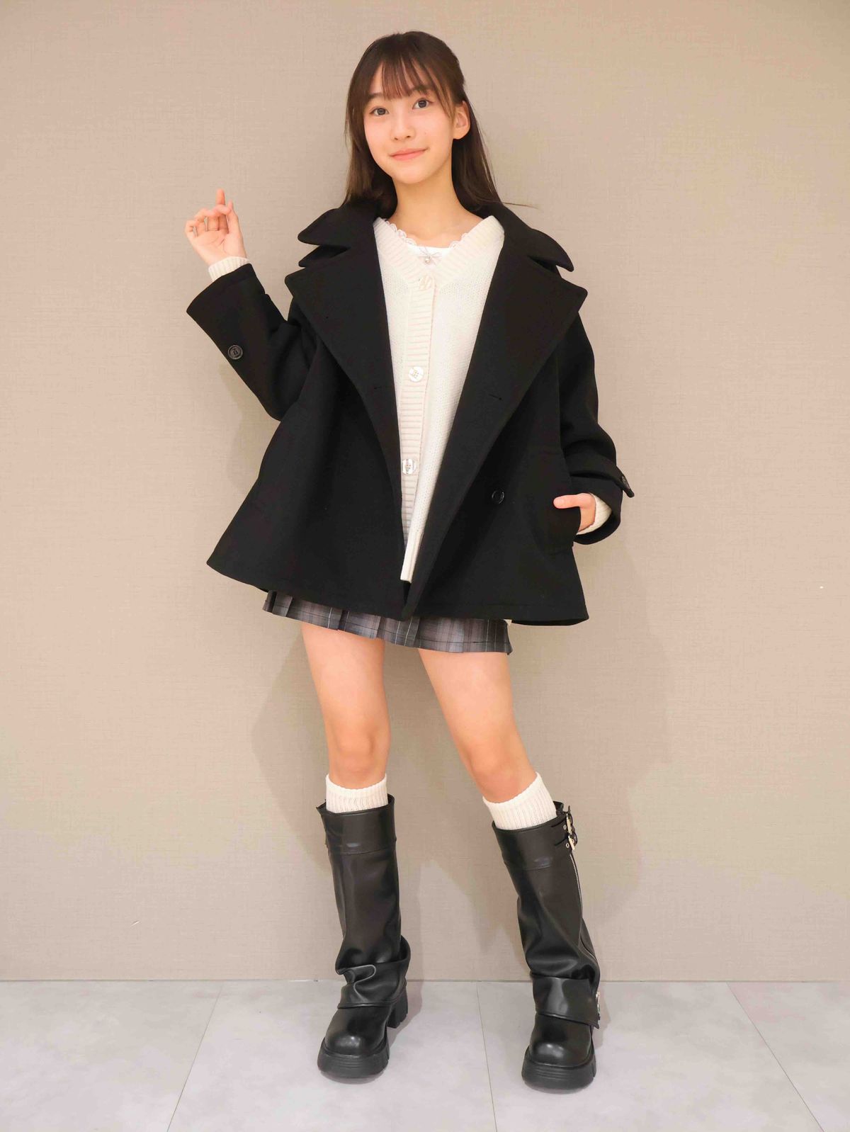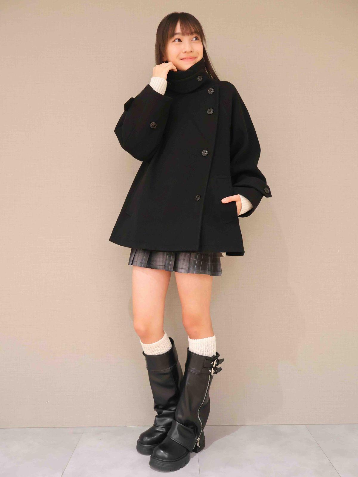 コートの前をしめて、えりを立てるとスッキリとスタイルよく見えるお姉さんコーデに!チェックのスカートとロングブーツで脚長効果も!