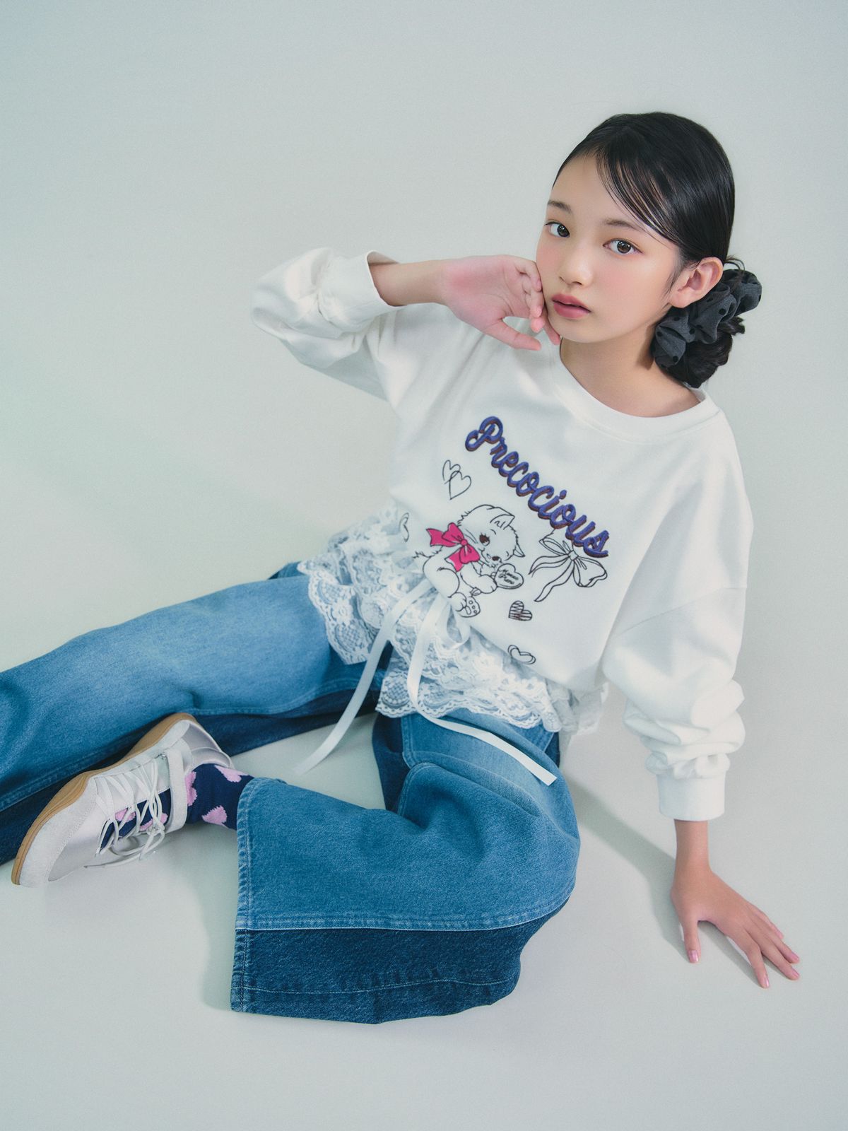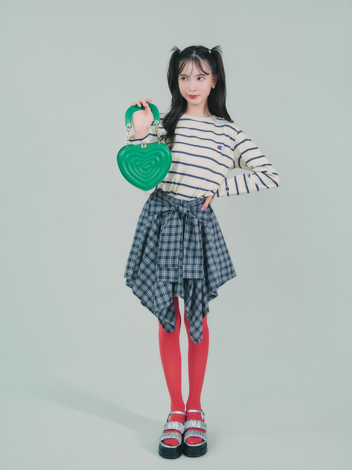 どんなボトムスもこれ1つで今年顔に変身。腰巻き以外にも、ななめがけやビスチェ風など……見せ方のアレンジはたくさんあるよ!もも☆ラップスカート¥1760/バイ ラビット トップス¥9790/メゾ ピアノ ジュニア デニム¥7990/GapKids※一部店舗限定 シュシュ¥880/SPINNS ソックス¥1210/靴下屋(タビオ) シューズ¥2990/ジーユー