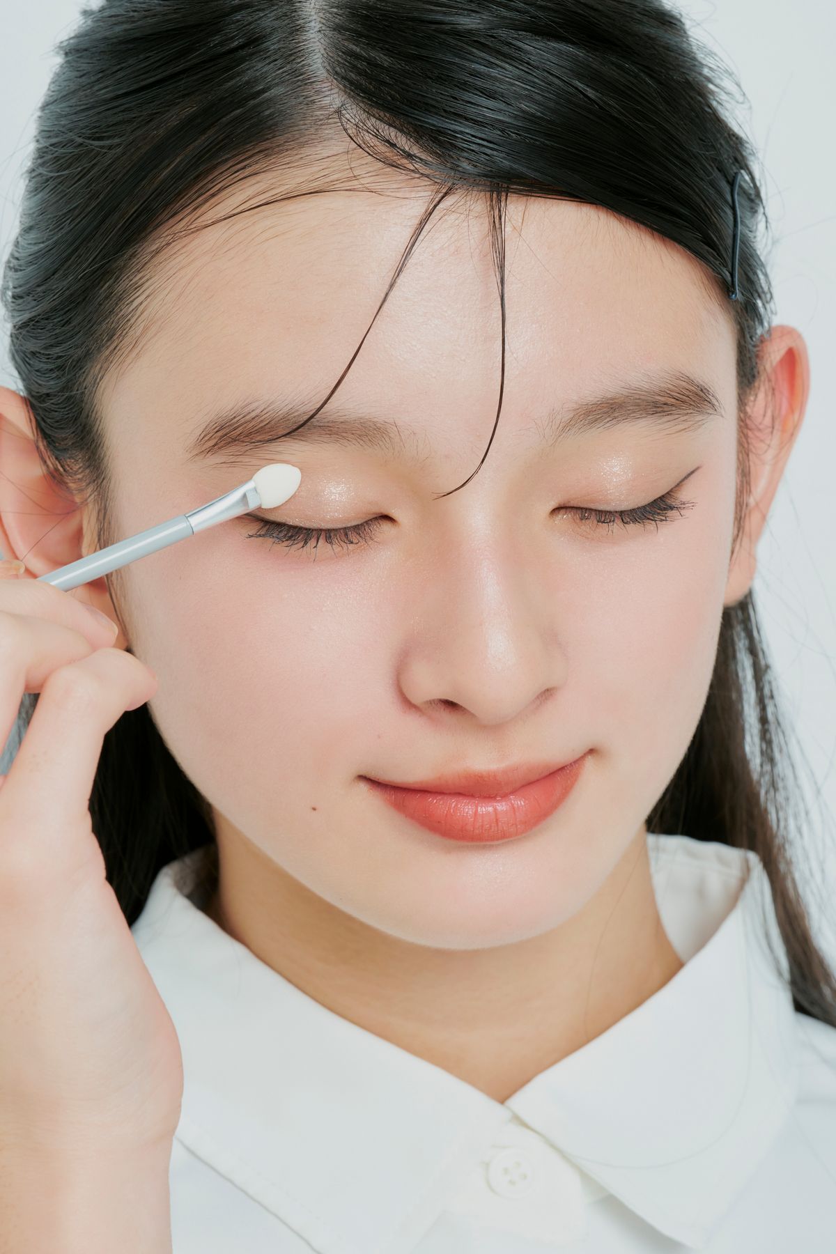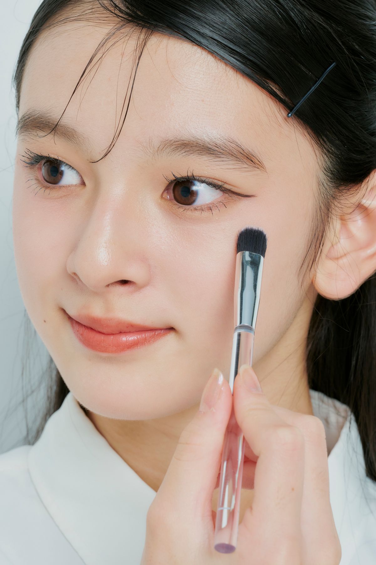 鼻先や、ほおなどにハイライトを細かく入れてみて。とうめい感×立体感で、おしゃれなメイクの完成!