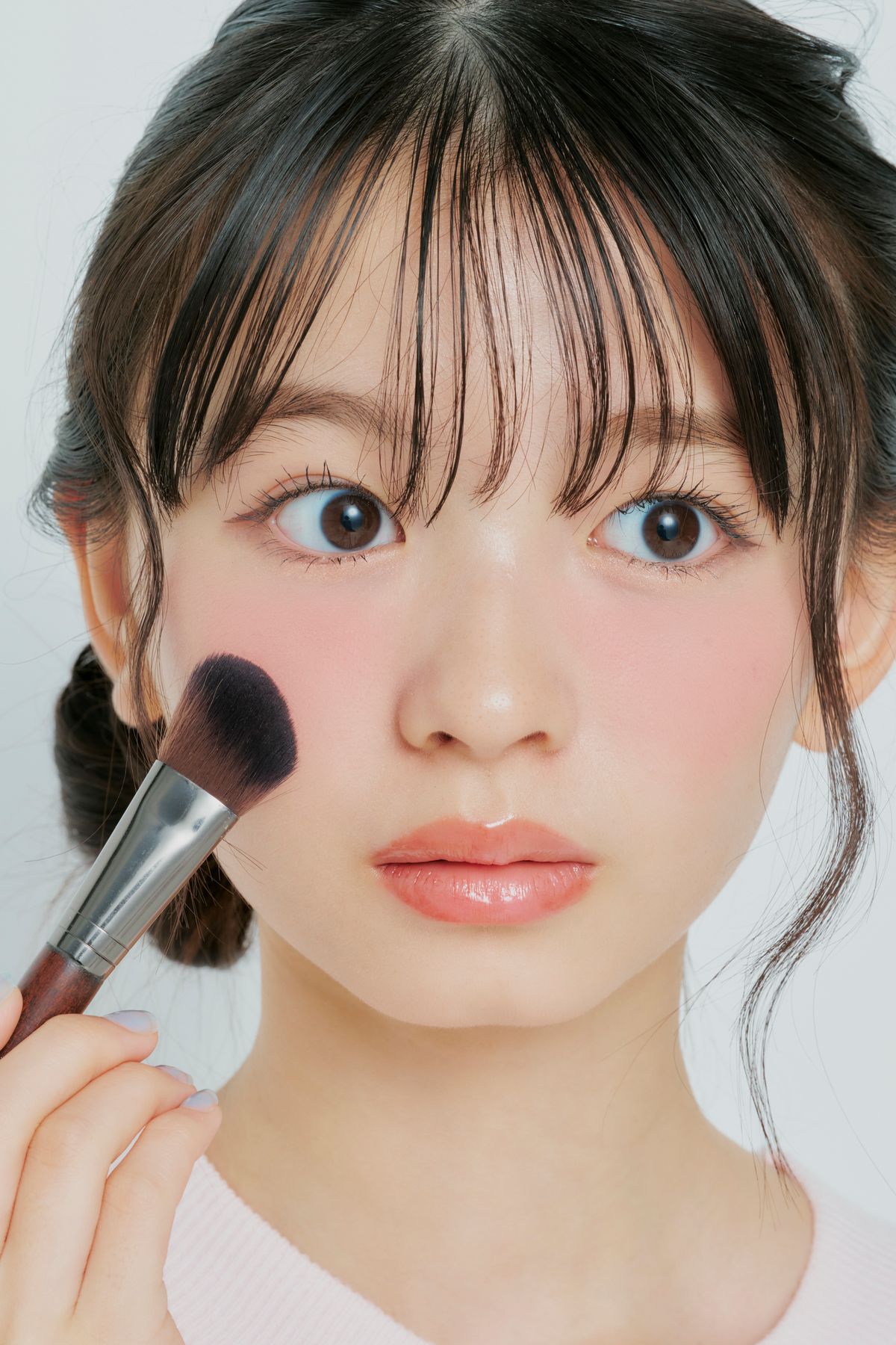 目の下あたりから、ブラシで円をかくようにチークを入れよう。マットな質感のパウダーチークをしっかり発色させて、うさぎっぽいふんい気に。