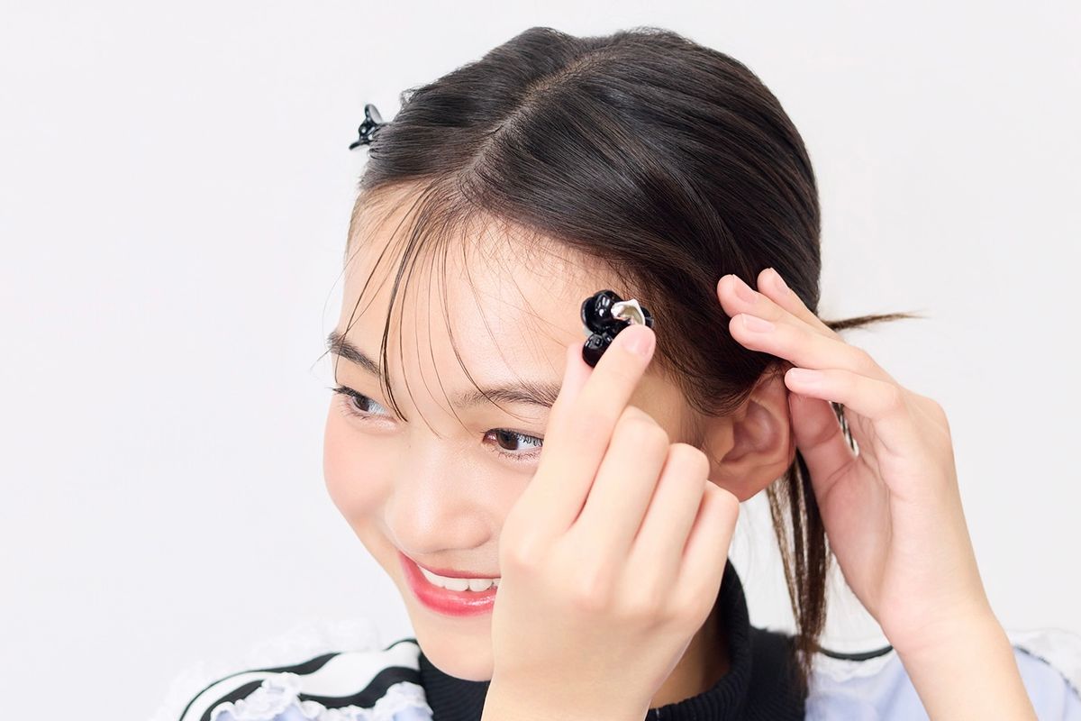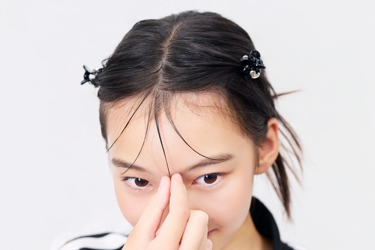 ②①で残した毛束以外の前髪は、小さめのヘアクリップを使って両サイドにまとめてね。