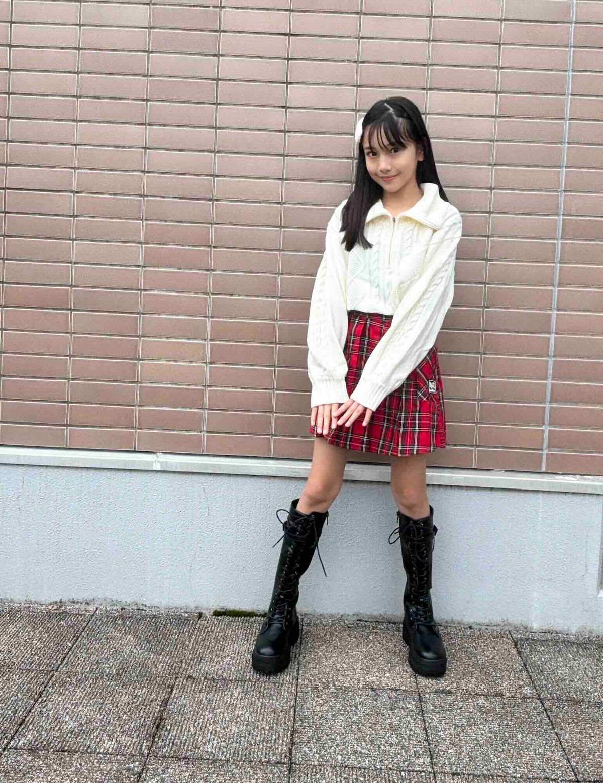 アルジーの真っ赤なチェックスカートに白いニットを合わせてクリスマス感ましまし🎄