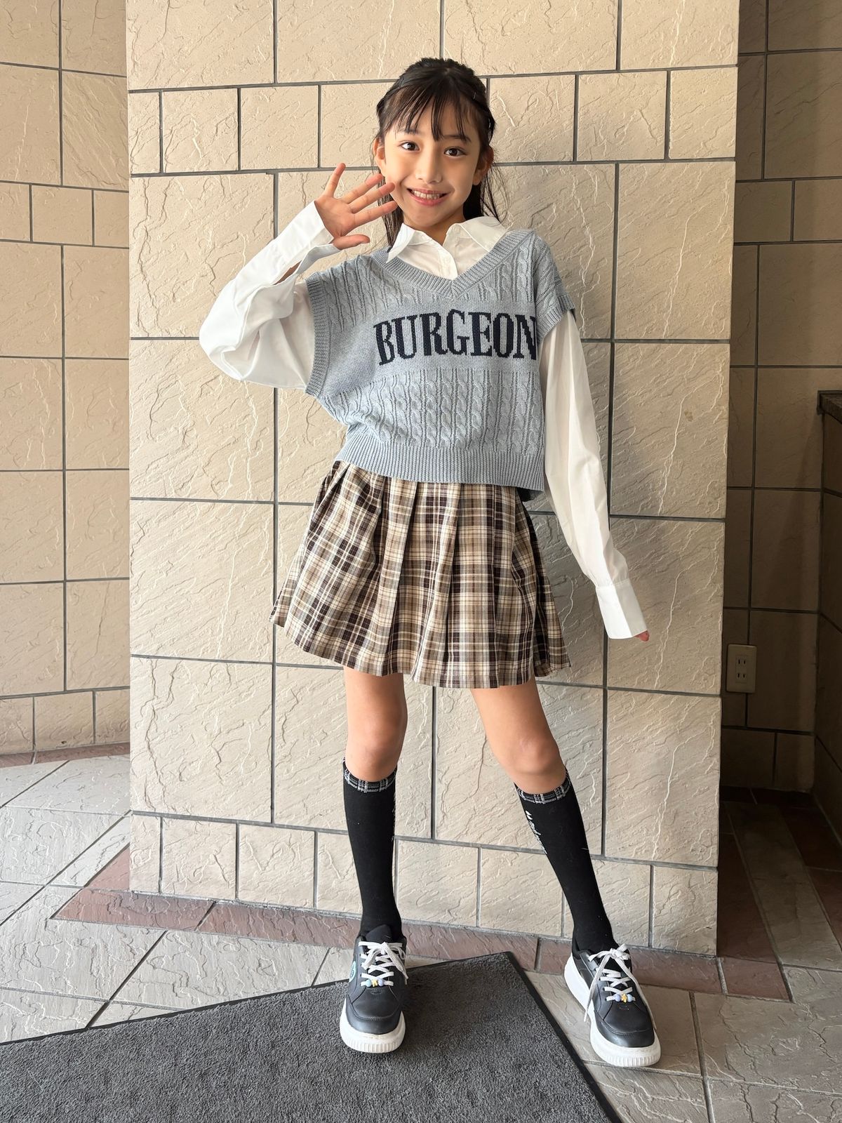 ラブトキの重ね着風トップスにチェックのスカートを合わせてスクールガールっぽく💡