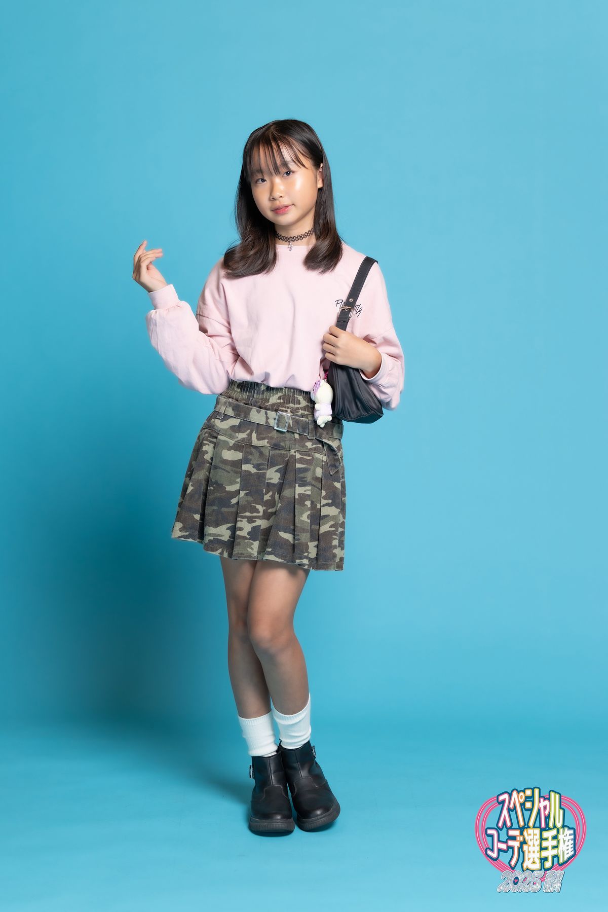 あわいピンクとクールな迷彩の甘×辛ミックスコーデ! 小物は黒でまとめてすっきりシンプルに♪