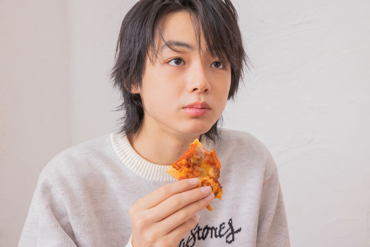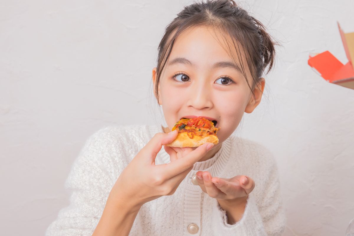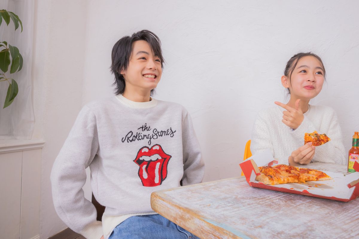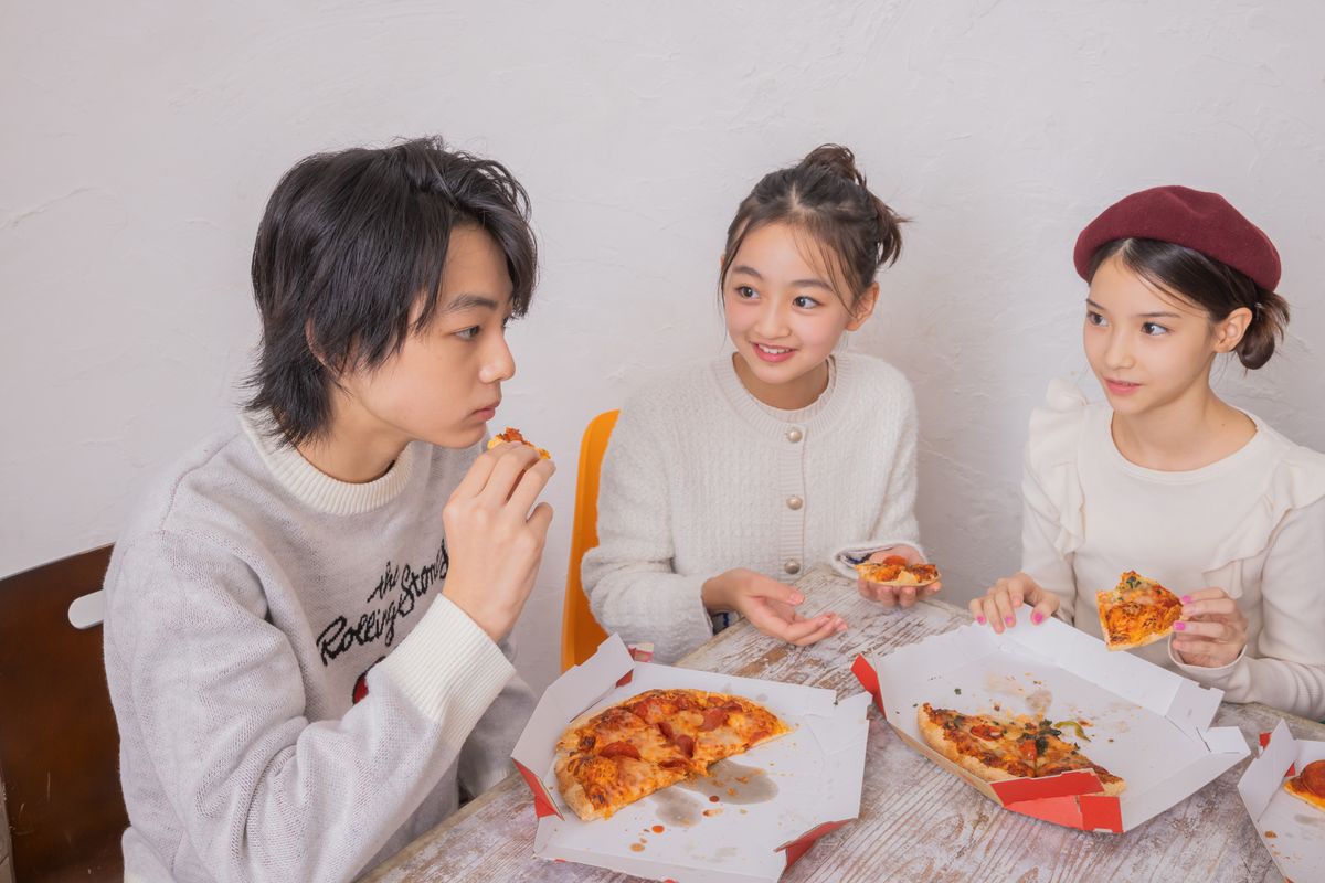 カエデとリナが先陣をきって試食♡ ピザは「マルゲリータ」「アメリカン」「ドミノ・デラックス」から好きなのを選んで食べるよ♪