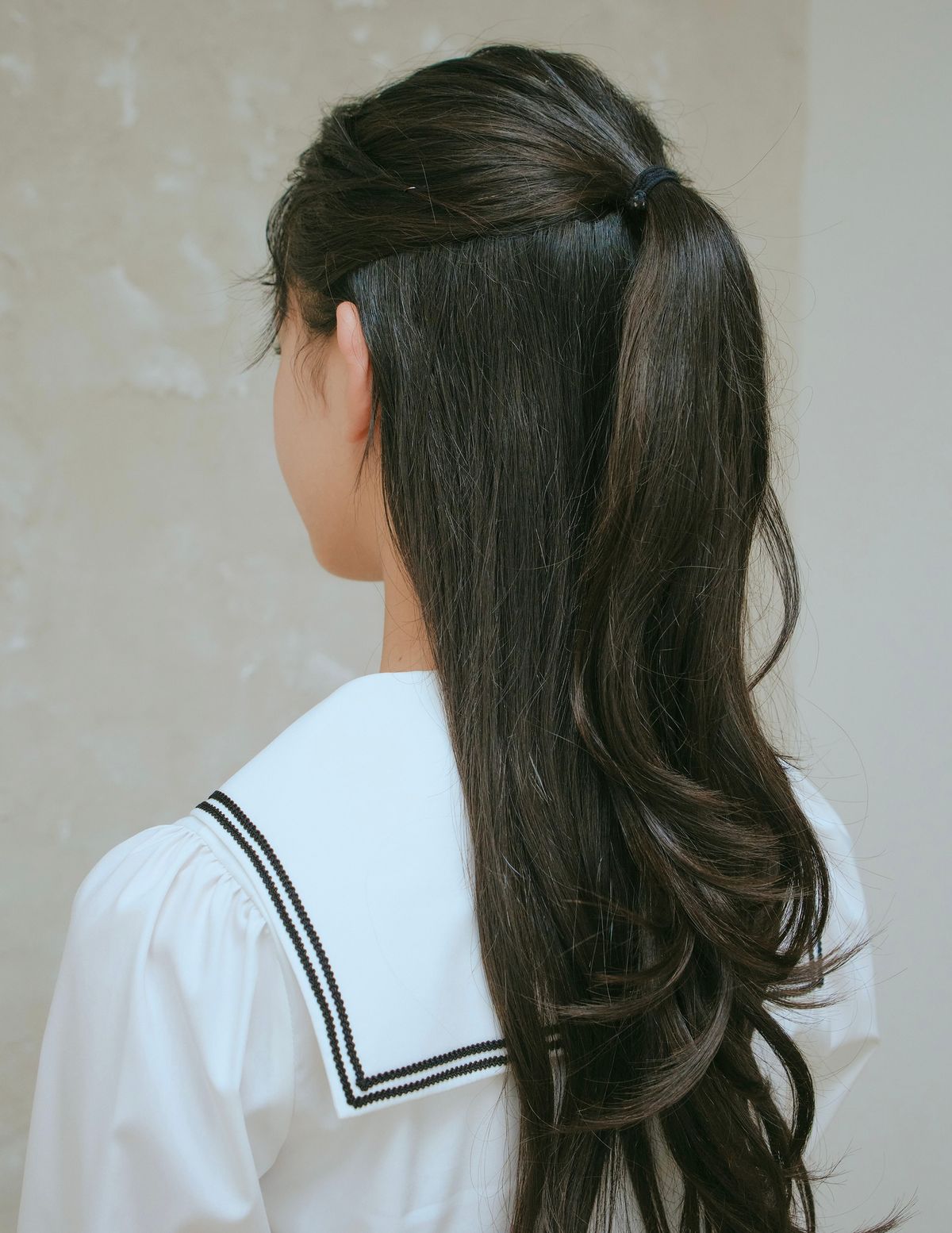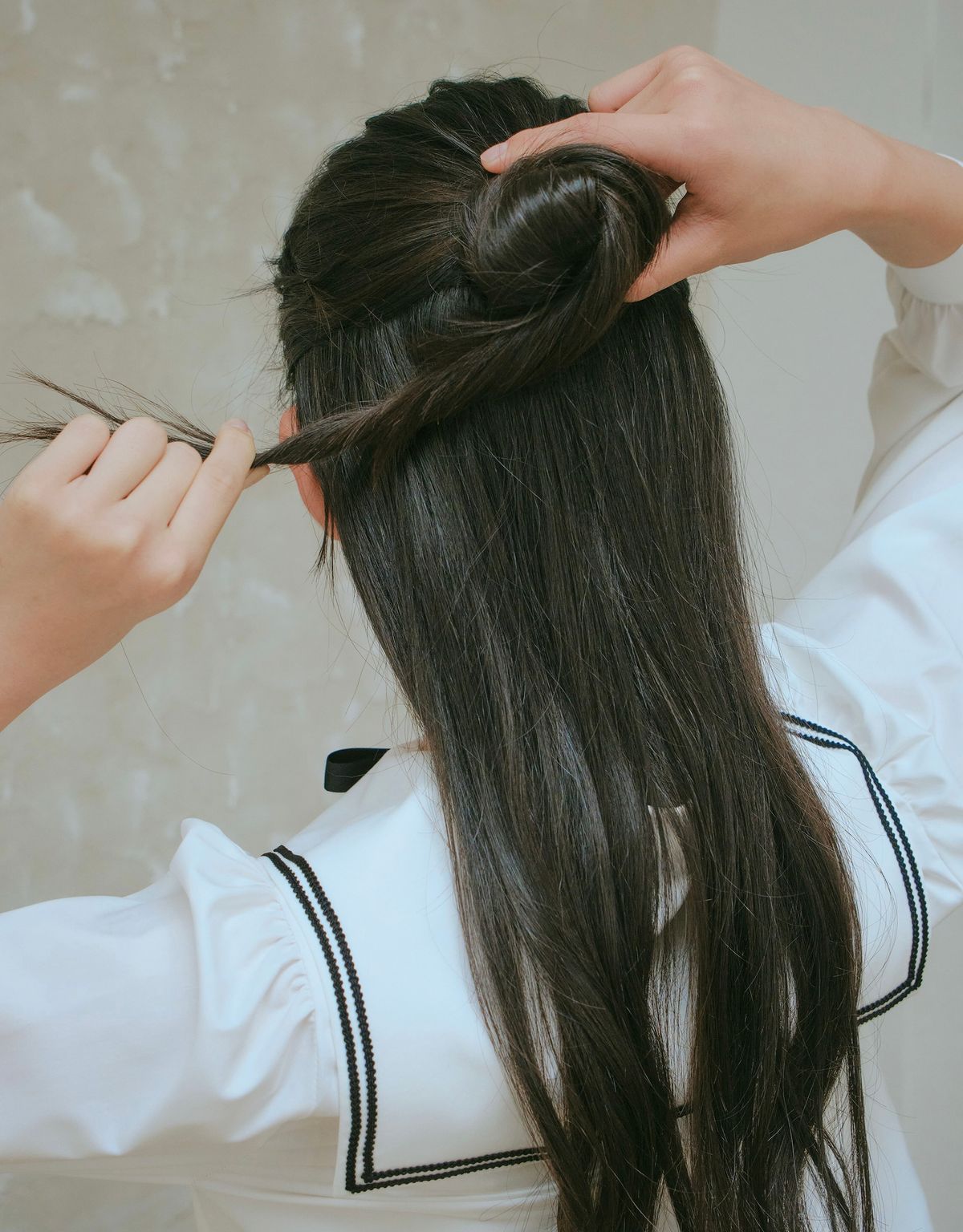 ①トップと耳上の髪を手ぐしで集め、耳より2cm上くらいの位置で1つに結ぶ。イヤマフのヘッドバンドが頭のうしろに来るから、結ぶ位置は高めが◎!