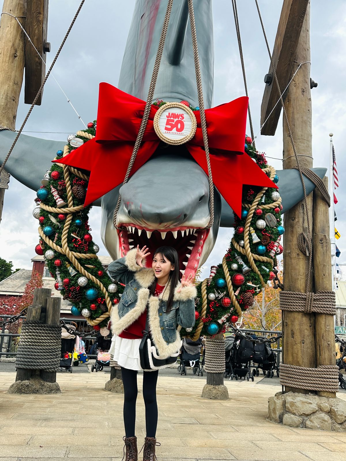 映画「ジョーズ」の公開から2025年12月で、なんと50周年! ってことで、パーク開業時から人気の『アミティ・ビレ ッジ』全体がお祝いムード。”ハンキング・シャーク”の記念撮影スポットでは、クリスマス・ リースがかざられているよ。
