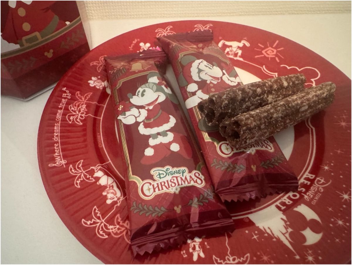 左からチョコレートチュロススナック🍫ミッキーのマシュマロ入りココア☕️ツリーのオーナメントになるキャンディ🌟オーナメントのキャンディはお友達のお土産にピッタリ🎁🎄