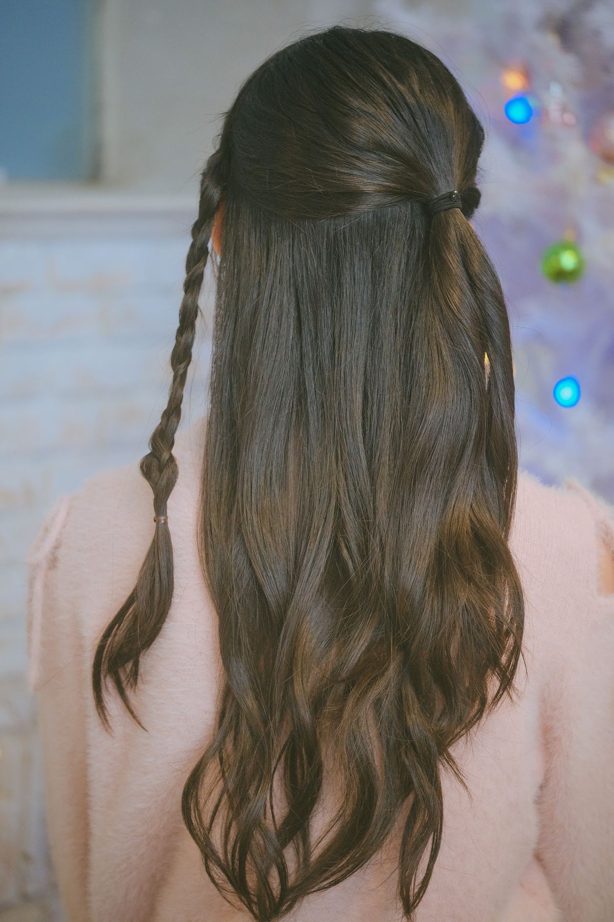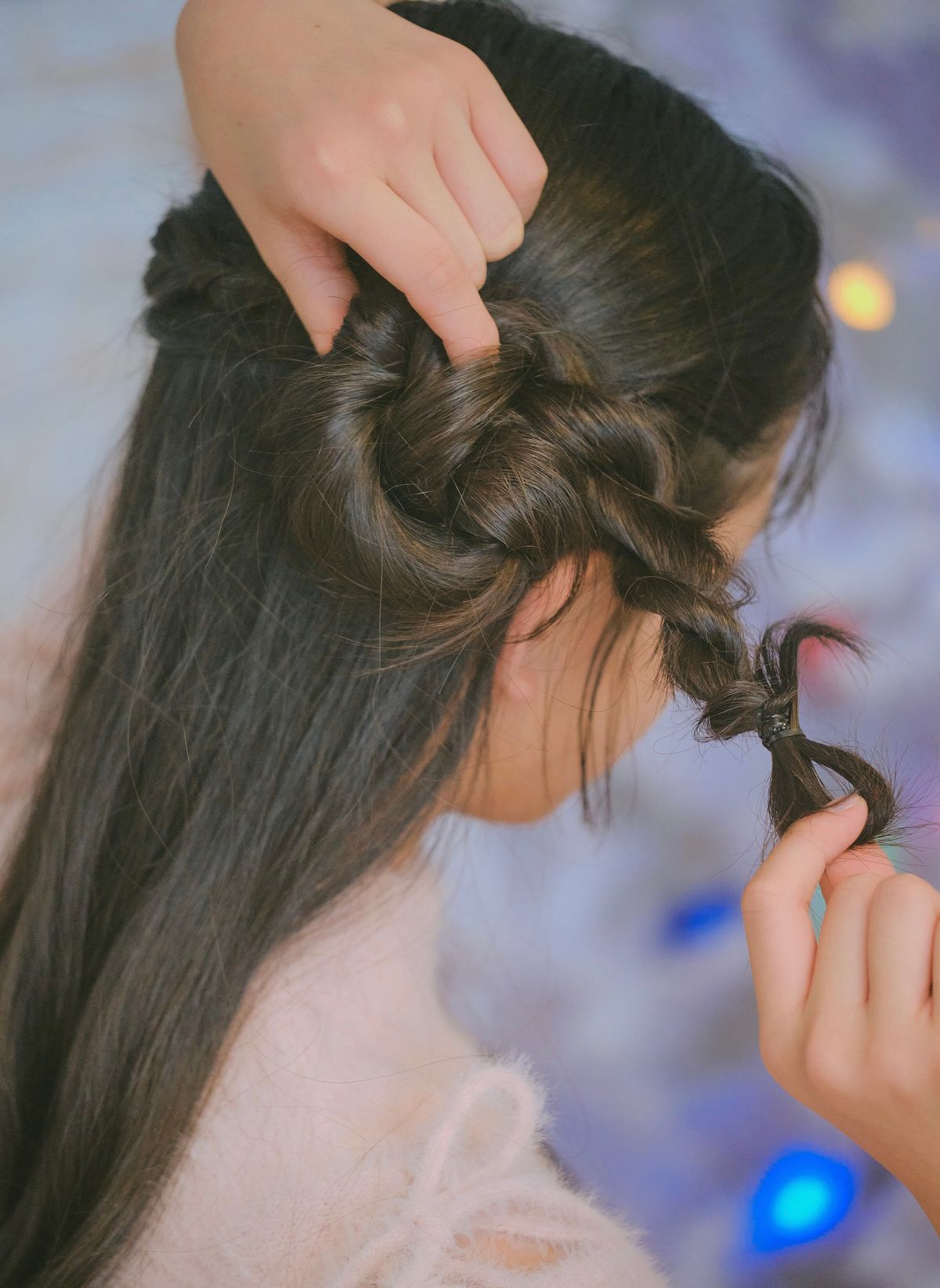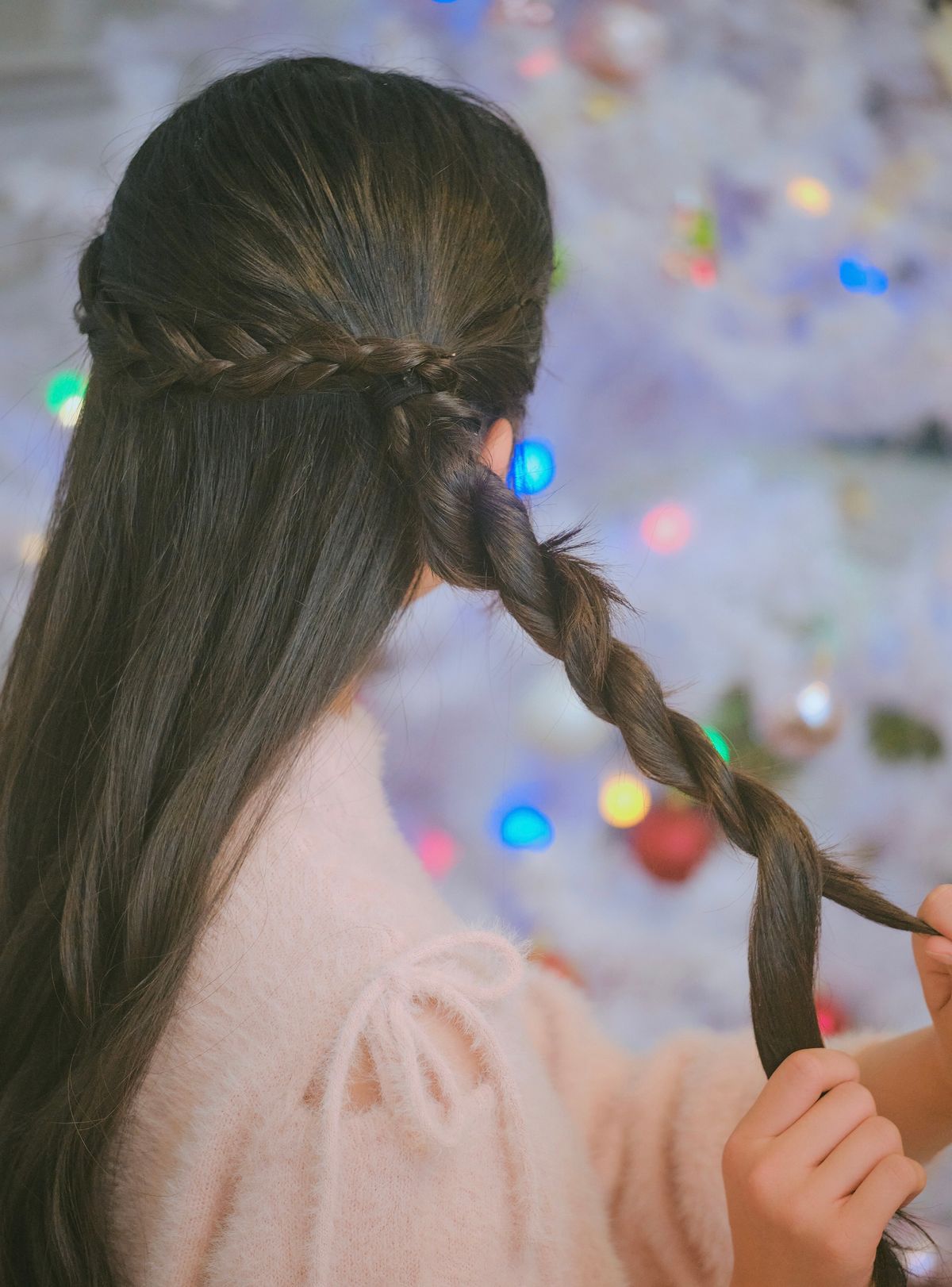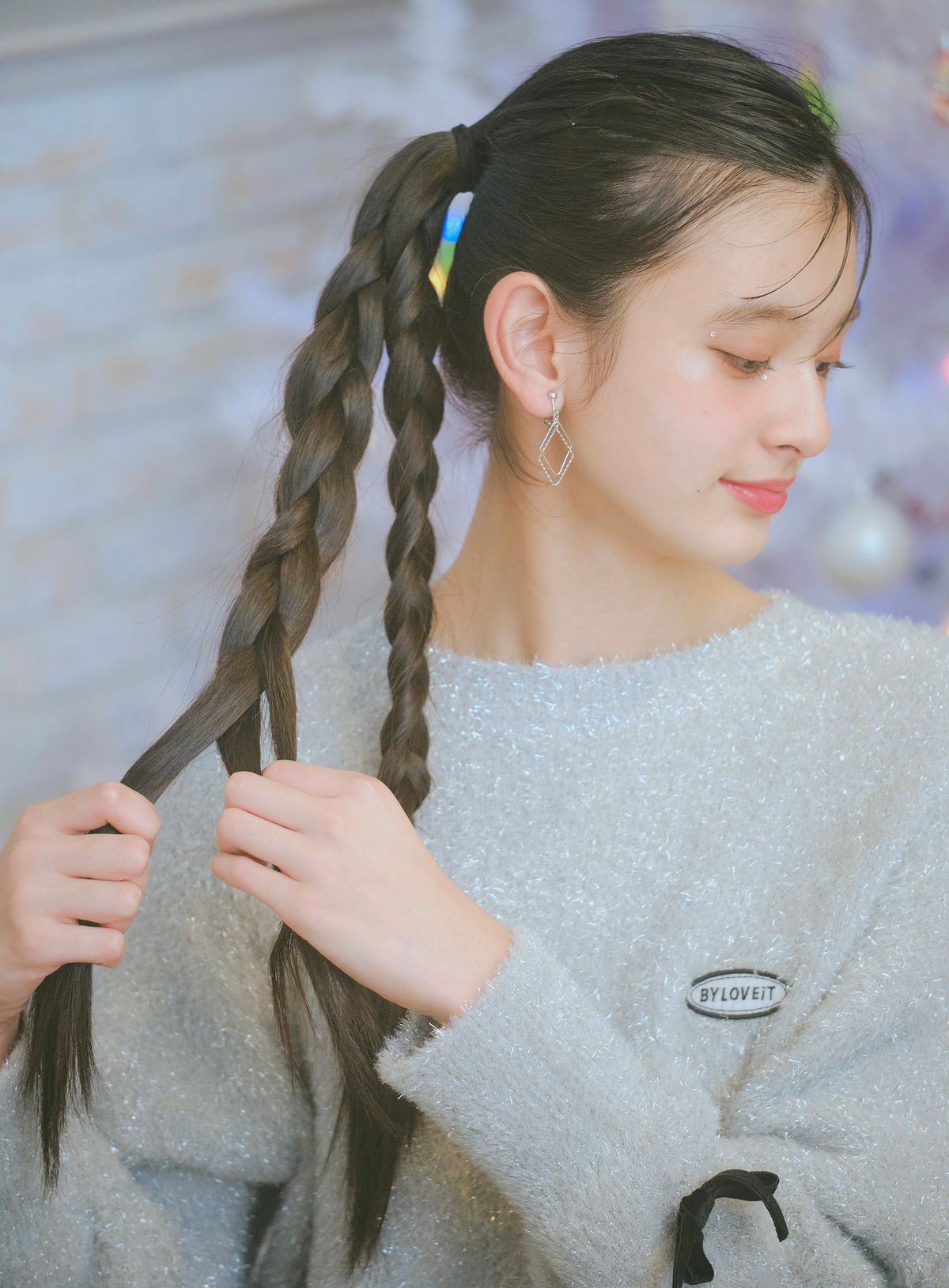 ②残りの1/3の髪を2束に分け、それぞれみつあみをして完成。2本のみつあみは細めの方がかわいい!
