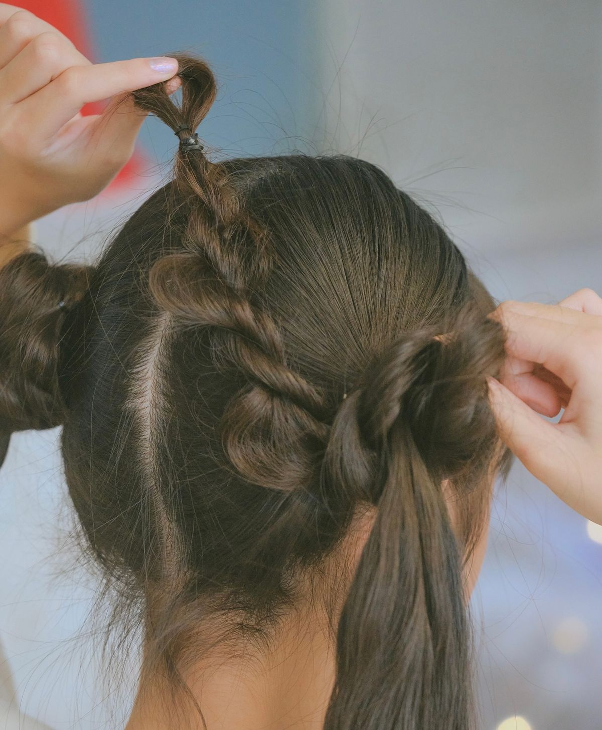②みつあみを1つ結びの根元に巻きつけ、ピンで固定する。1つ結びをした髪は2束に分け、ねじり、毛先をわっかにしてゴムで結ぶ。