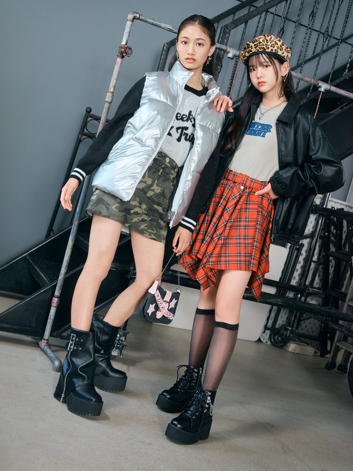 チェーンつきブーツはうちらのためにあるようなもの。ハデながらアイテムをチョイスして強めギャル度高めてこ☆リサ☆ブーツ¥13189、ベレー帽¥2178/ともにヴォルカン&アフロダイティ渋谷109店 ブルゾン¥7689/ピンク ラテ トップス¥3960、スカパン¥5390/ともにシスタージェニィ イヤカフ¥660/パリスキッズ原宿本店 ネックレス¥590/ジーユー ハイソックス¥759/チュチュアンナ