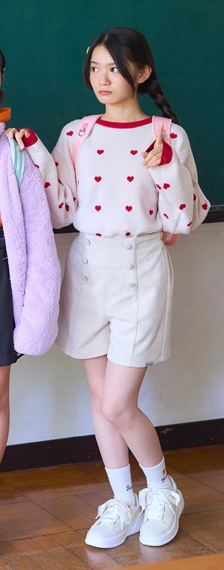 ハート柄のロマンチックなニットにキュン♡ ハイウエストのショーパンなら、白も着ぶくれしにくいよ!