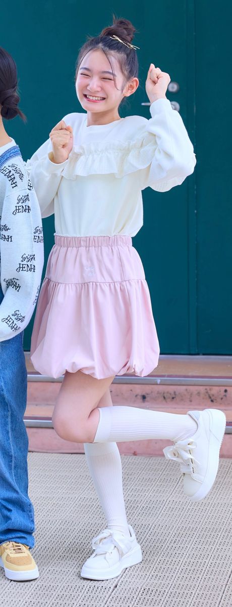 スカートとフリルスウェットでいちごムース風仕上げに♡ ハイソを合わせれば憧れの韓ドル風コーデ!
