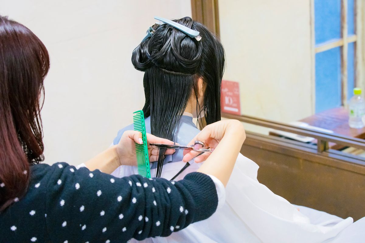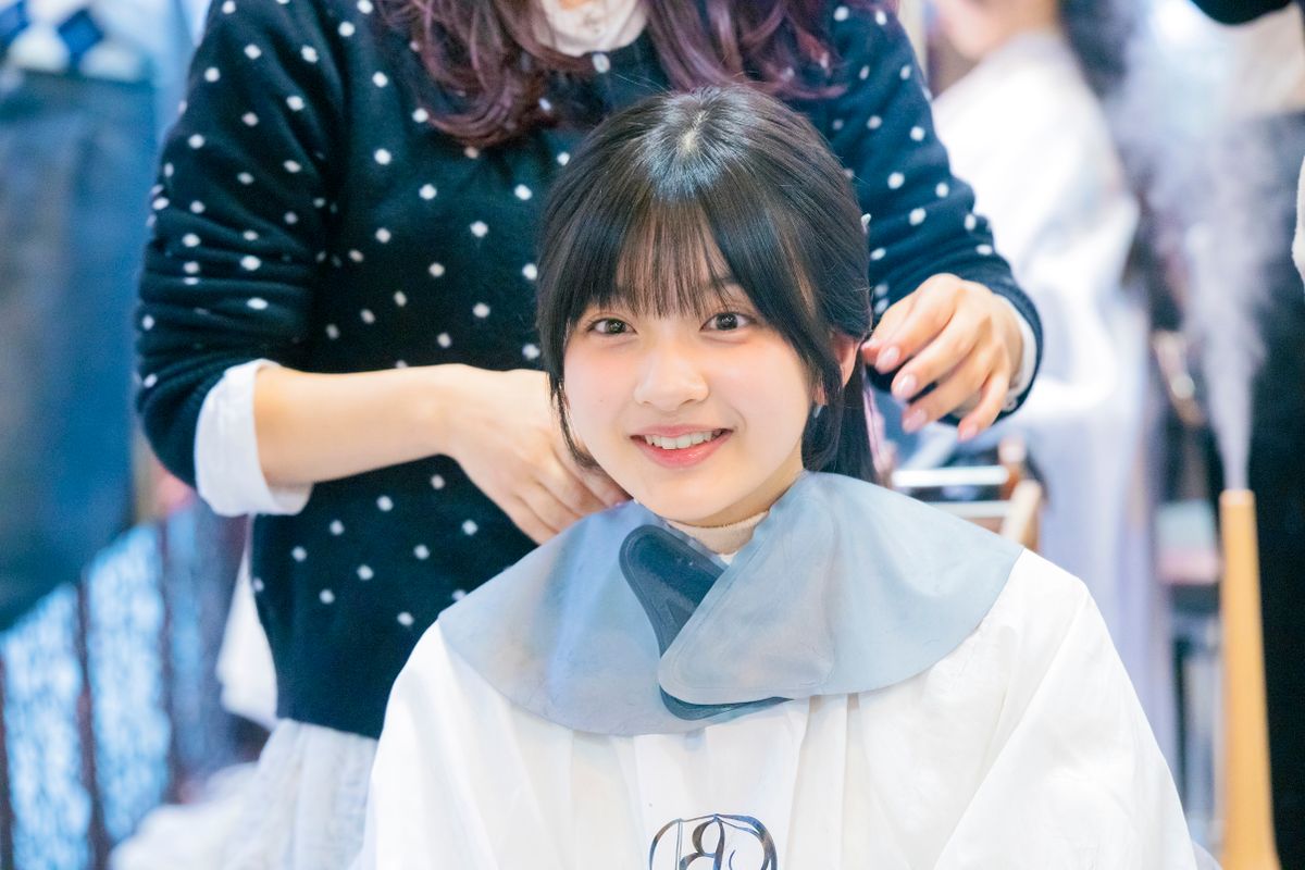 定番のロングスタイルのミオ。肩くらいまでのバッサリカットを希望ということで、毛先を軽めにした動きのあるミディアムヘアにチャレンジ!
