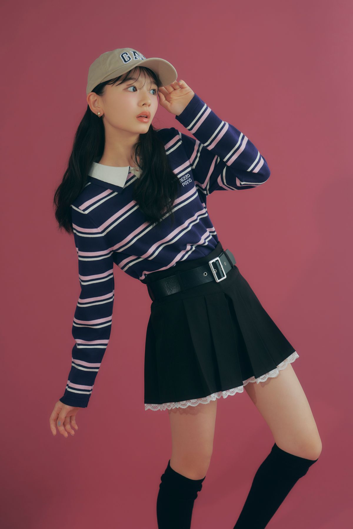 プリーツミニにえりつきトップスで、プレッピーなふんい気をいかしつつ、キャップで外すのがtトレンド感! ハイソでドーリーな要素も加えてみて。
