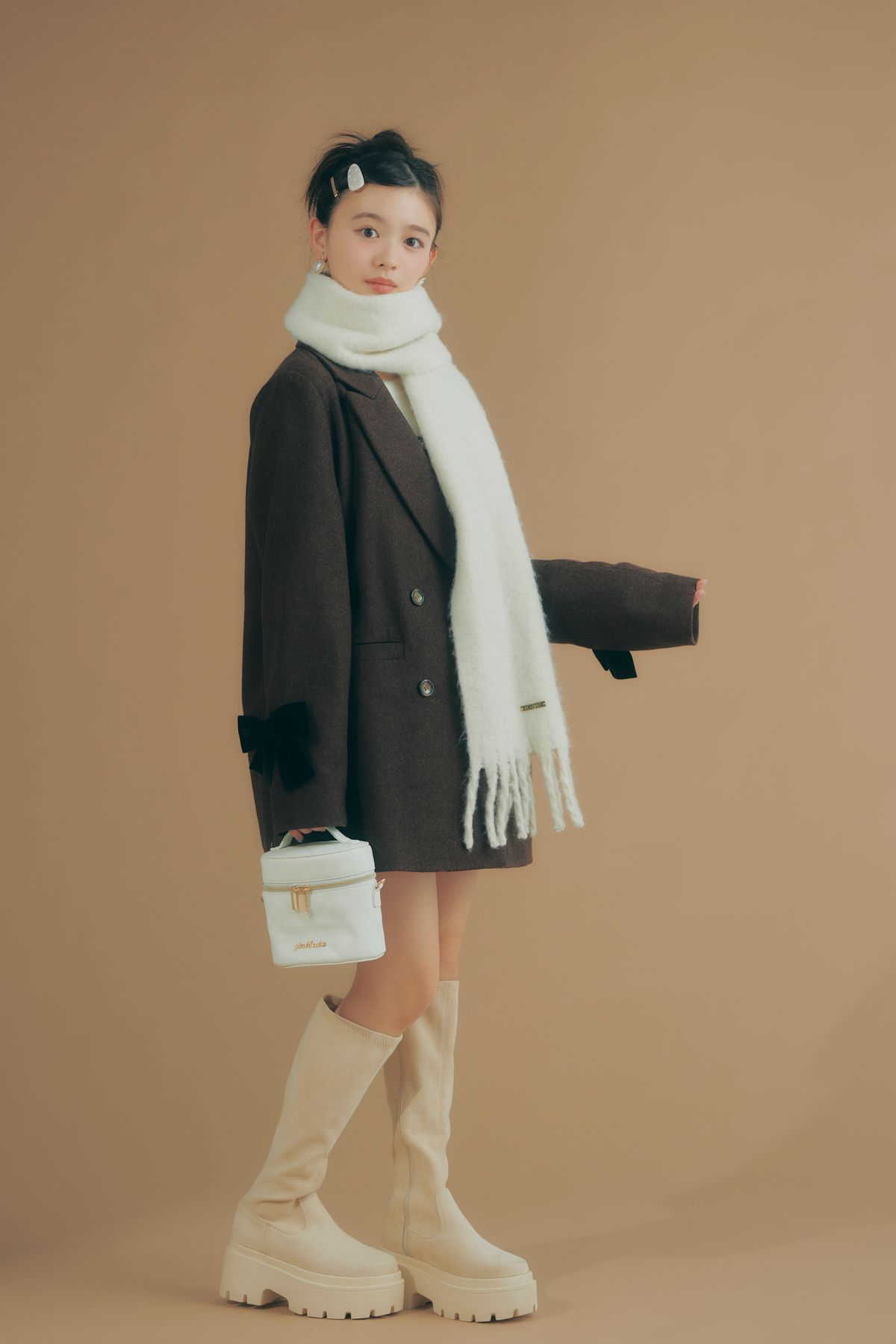 コート¥14080、マフラー¥4290/ともにバイ ラビット ニット¥4939/ピンクハント ヘアピン(3個セット)¥590/ジーユー イヤリング¥770/ミナキュート(メテオAPAC) バッグ¥3990/ピンク ラテ ブーツ¥6589/SPINNS