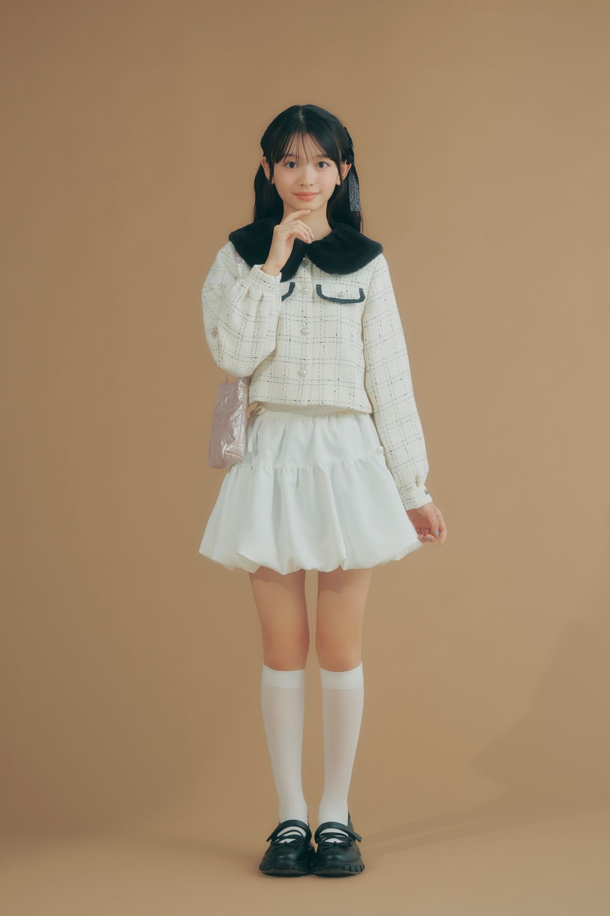 ジャケット(キュロットとセット)¥8900/ブルーデイジー(ホープス) スカート¥4829/ピンクハント ヘアピン330/ラティス バッグ¥429/サンキューマート ソックス¥880/靴下屋(タビオ) シューズ¥8800/オリエンタルトラフィック(ダブルエー)