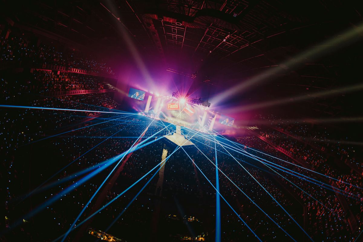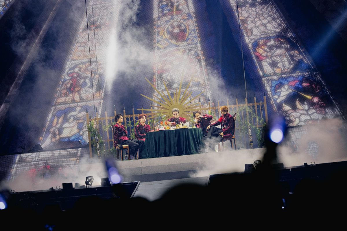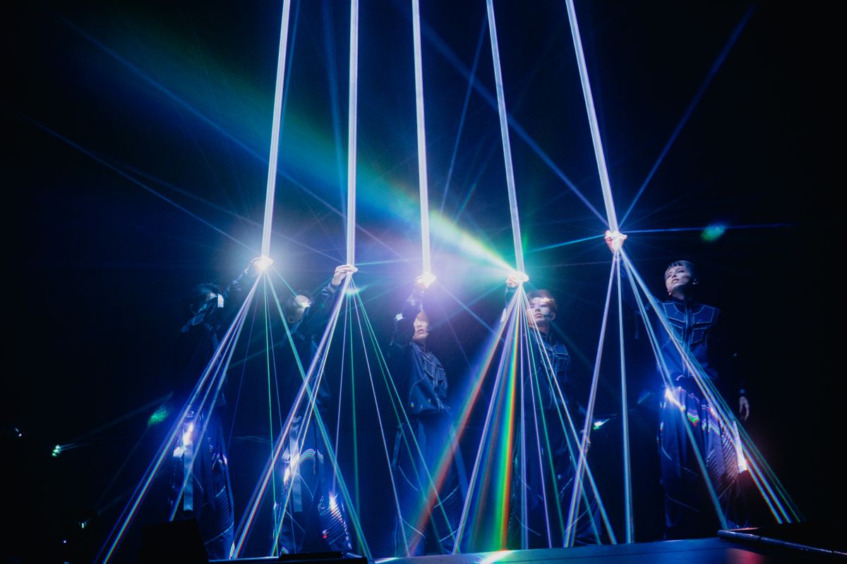 幕開けとは対照的に、光を求めて暗闇のなかをさまよう5人の映像を挟んでは、ステージから放たれるレーザー光線のアートがアリーナ空間を彩っていく。そして戦士を思わせる紺色の衣装に着替えた5人が再び現れてからは、『LUMINA』というツアータイトルに合わせて“光”をモチーフにした楽曲が連投された。まずTETTAの美しいハイトーンで幕開ける「The Light」では、二段に組まれたステージを効果的に使った奥行きの感じられるパフォーマンスで魅せ、間奏ではムービングレーザーを使った演出も。