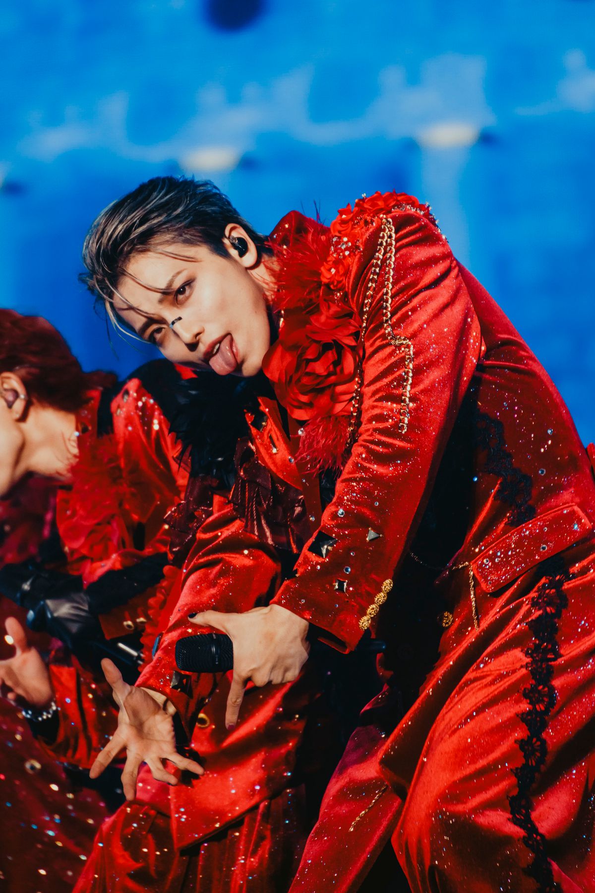 続いて『AMAZONIA』のリード曲である「Gooey」を前に、TETTAからコール&レスポンスのレクチャーも。初日は初のアリーナということではしゃぎまくり、花道に出て発声練習から始め、返ってくる声の大きさに「ぴあアリーナでこれできたのホントに気持ちいいわ! 素晴らしい! マジで!」と大喜びする。2日目は客席を上手と下手の2つに分けて“Ey-yey”のコール対決を実施。甲乙つけがたい声量に引き分け判定をしたTETTAに、NAOYAがダッシュしてバックハグするサービスショットでもSWAGを沸かせた。そしてグミをモチーフに、ポップからド-プ、さらに美メロと幅広い音色で楽しませる「Gooey」が、中毒性たっぷりに大舞台で炸裂。練習の甲斐あってSWAGが大音量のコールを贈ったところで、間髪いれずアクセルを噴かせたのが鉄板曲「EVOL」だ。「この曲も声出していこうぜ!」(HAYATO)、「俺らに全部あずけてこい!」(NAOYA)と煽って、SWAGがペンライトと共に上げる凄まじい“Hey!”のコールと熱い一体感は、もはや彼らのワンマンライブに無くてはならないもの。そんな武器を序盤で投下するところからも、出し惜しみすることなく持てるものをすべてぶつけようという5人の意気込みがうかがえる。