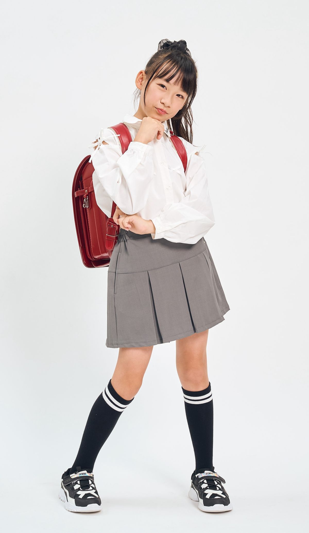 モノトーンでシンプルめに合わせた、リアル通学コーデ♪ 肩やヘアアクセのリボンでおしゃれも忘れないよ!