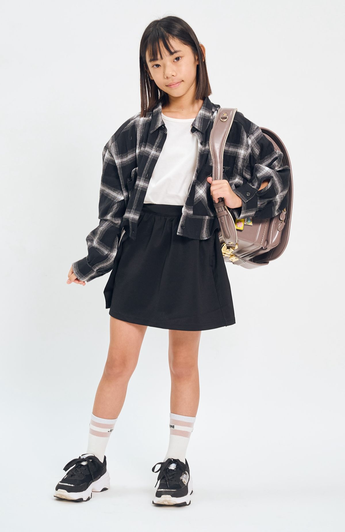 白T×黒スカートに、チェックシャツをはおって秋らしさをオン。シンプルおしゃれこそ学校コーデでセンス出る☆