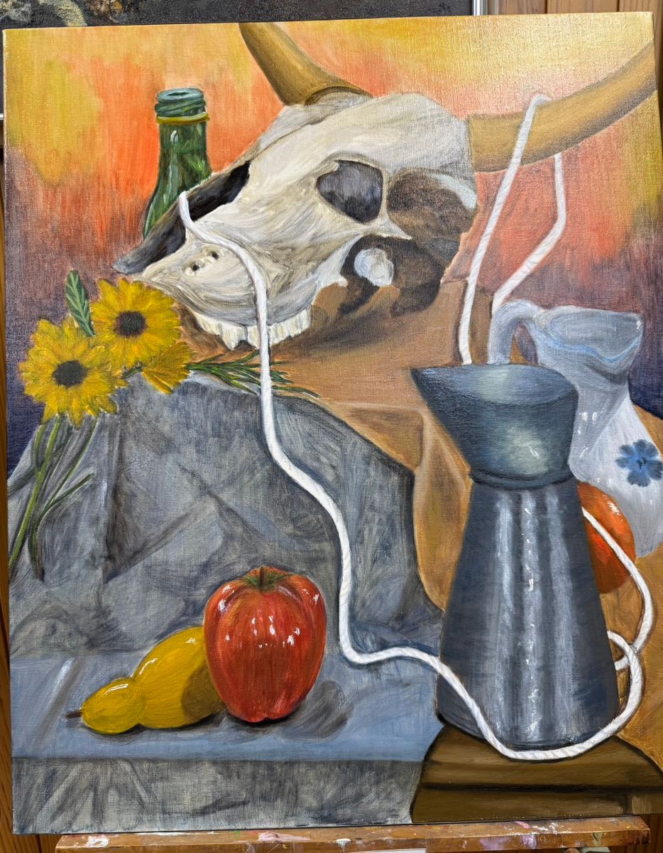 リコは、中学で美術部に入っていつも頑張ってるよ🖼この絵は、はじめて油絵を使って書いた絵です!牛骨を書くのもはじめてで、難しかった…