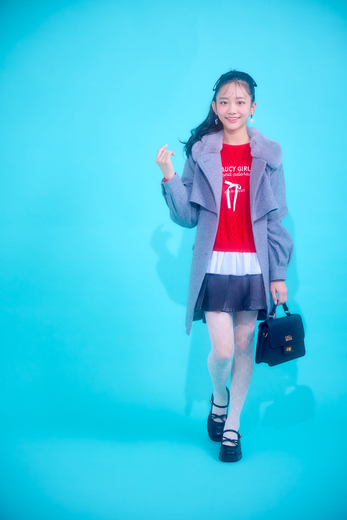 コートのベルトを後ろで結べば、 シルエットがスッキリして見える!ちひな☆ベルト付きコート ¥47300/メゾピアノ ジュニア ニット¥5940、タイツ(参考商品)/ともにバイ ラビット スカート¥4950、バッグ ¥5990/ともにピンク ラテ バレッタ¥550/ルナアース イヤリング¥799/グレイル シューズ¥8800/オリエンタルトラフィック(ダブルエー)