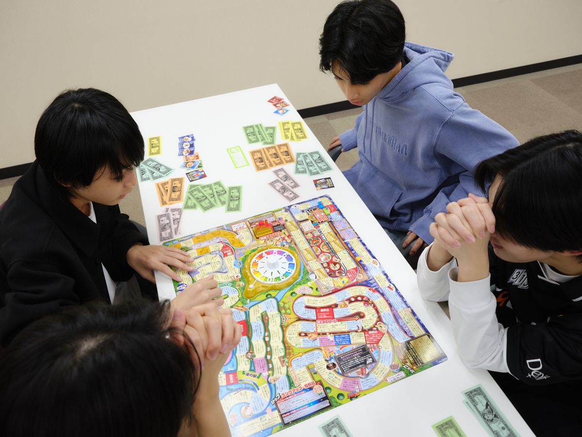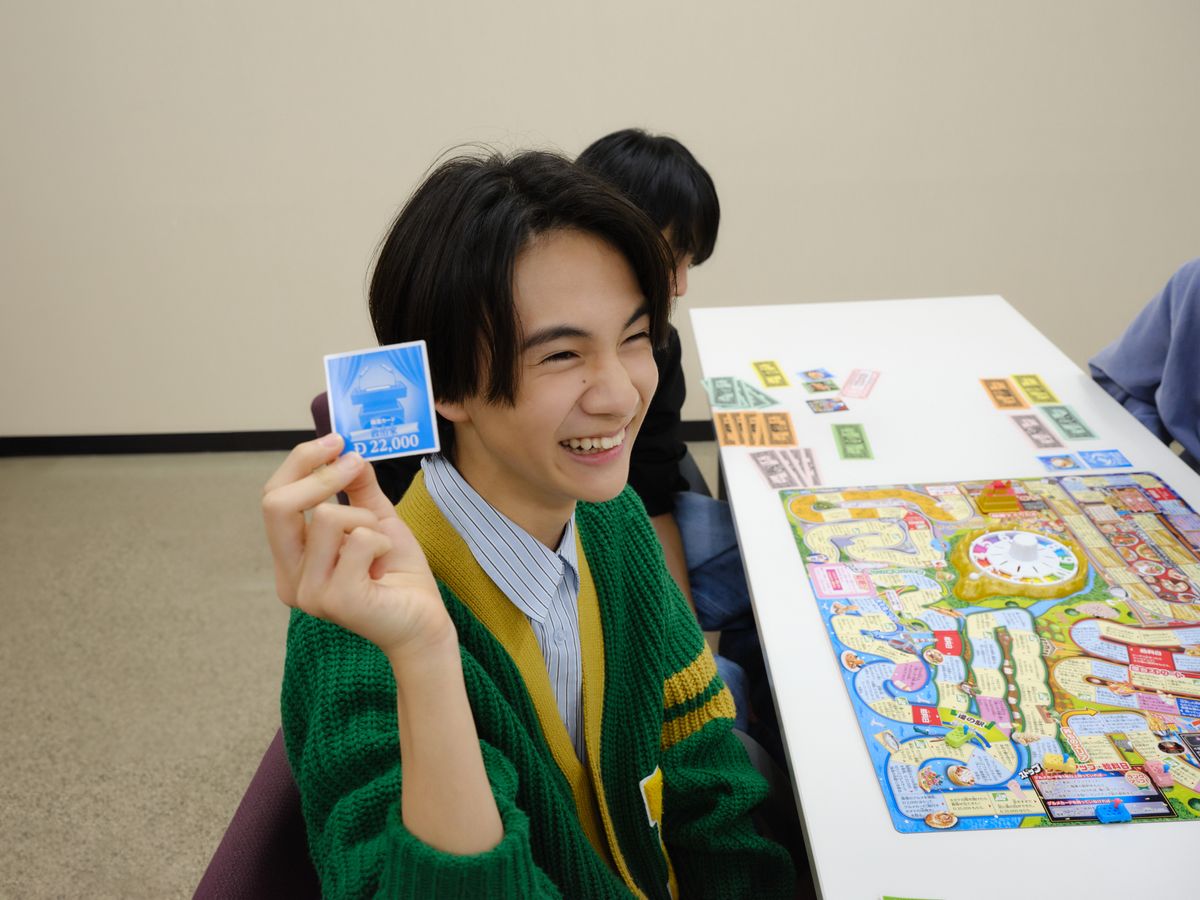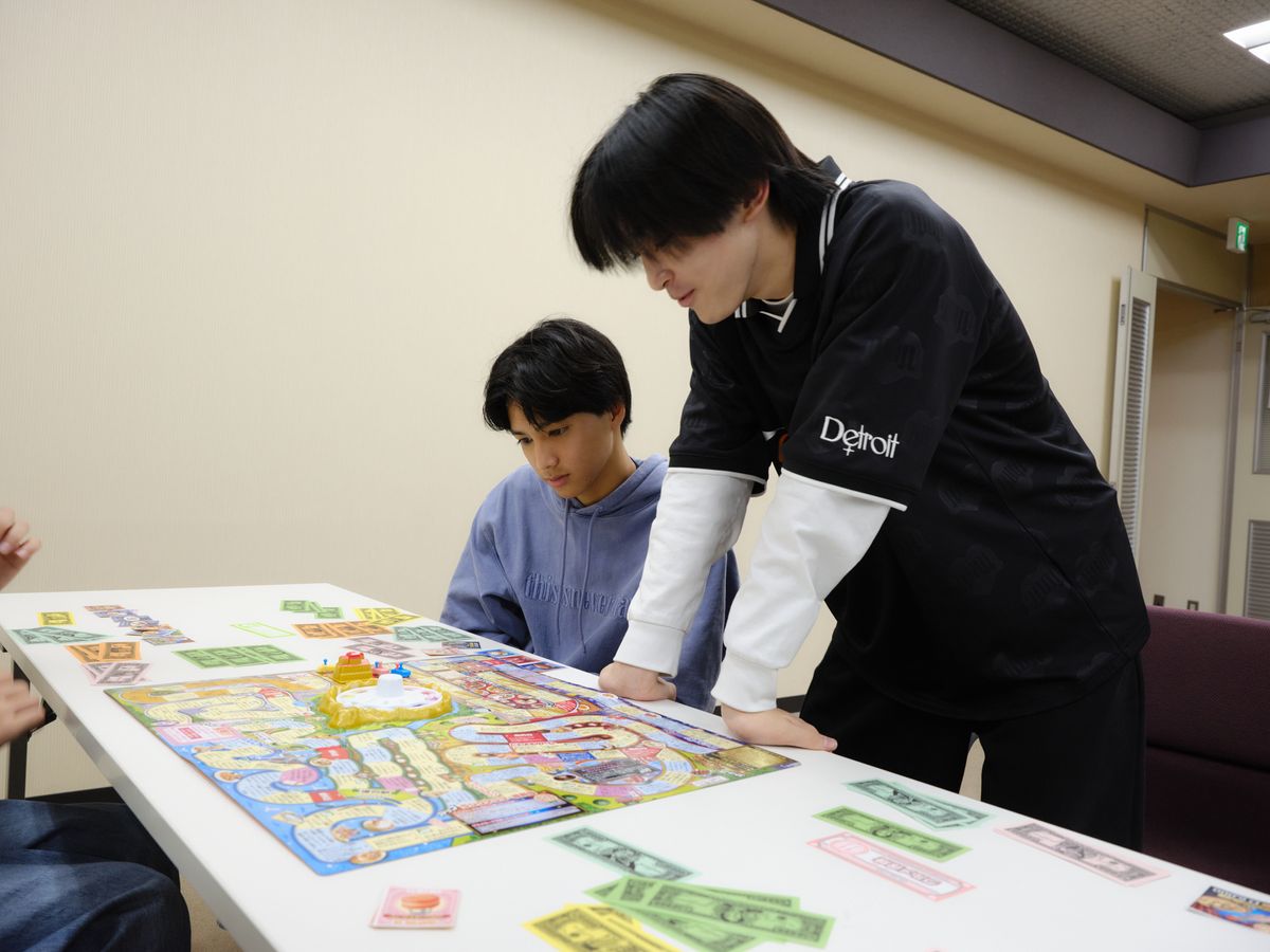 人生ゲームのマスは、とまるとお金がもらえるマスと、お金が減るマスがたくさん。さっそくお金が減り続けるケイ。