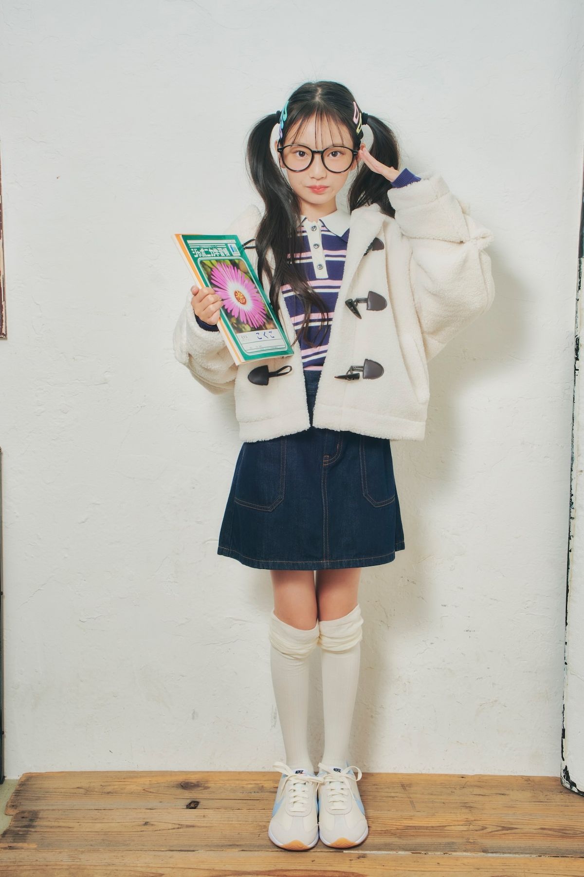 コートが映えるように中はネイビーのワントーンでまとめたよ。トレンドのポロトップスで気分はゆうとう生!もも☆トップス¥15290/メゾ ピアノ ジュニア スカート¥1990/ジーユー ヘアピン(6個セット)¥330、メガネ¥880/ともにパリスキッズ原宿本店 ソックス¥1430/靴下屋(タピオ) スニーカー¥9130/ナイキスポーツウェア