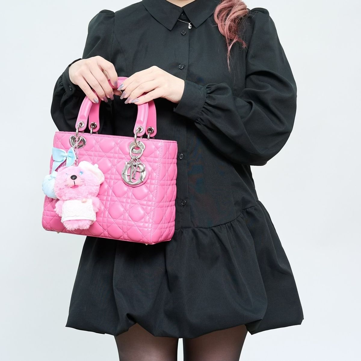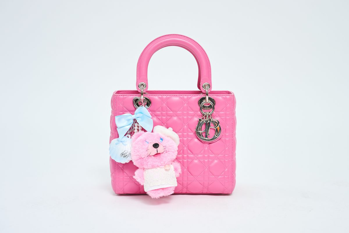 あこがれのレディディオール、素材、かたち、全部お気に入りですが、しいて言うならこのカラー! 大好きなパキッとピンクで、とにかく目立つ。ストラップは使わず、両手持ちする派です♡つけているチャーム