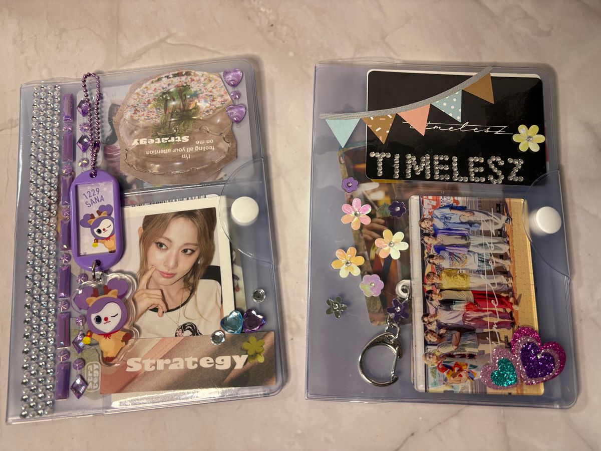 100円ショップに売っているクリアなお薬手帳ケースの中に、推しのグッズを入れてデコり、”推し手帳”として楽しむ文化のこと! 推しのイメージにあわせてデザインして、自分だけのコレクションを作るのが人気なんだって♡timeleszとTWICEのお薬手帳ケース