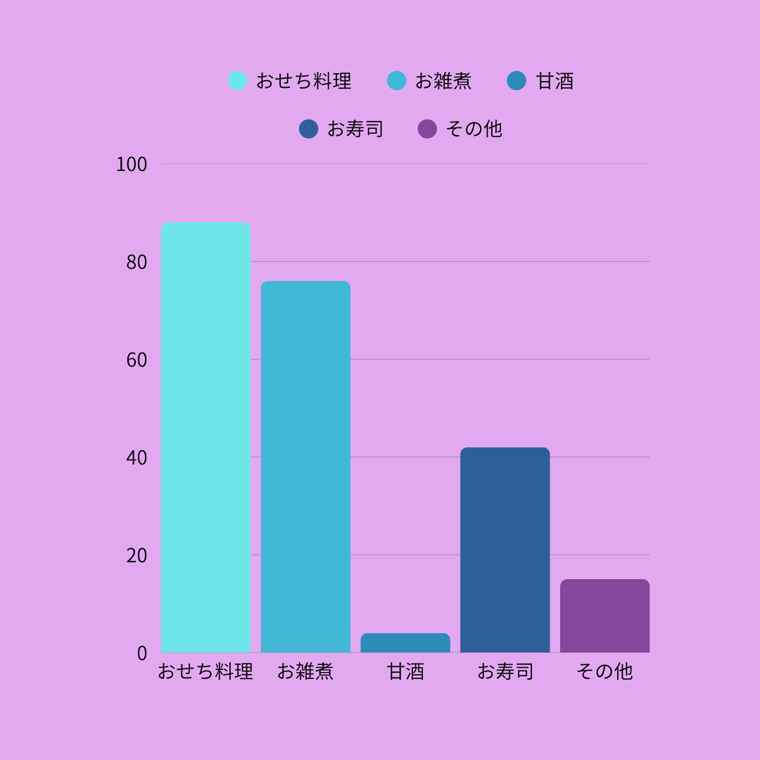 最も多かったのは、お雑煮。気軽に取り入れやすいお正月料理で、家庭ごとの味がある点も支持を集めた理由のようです。
