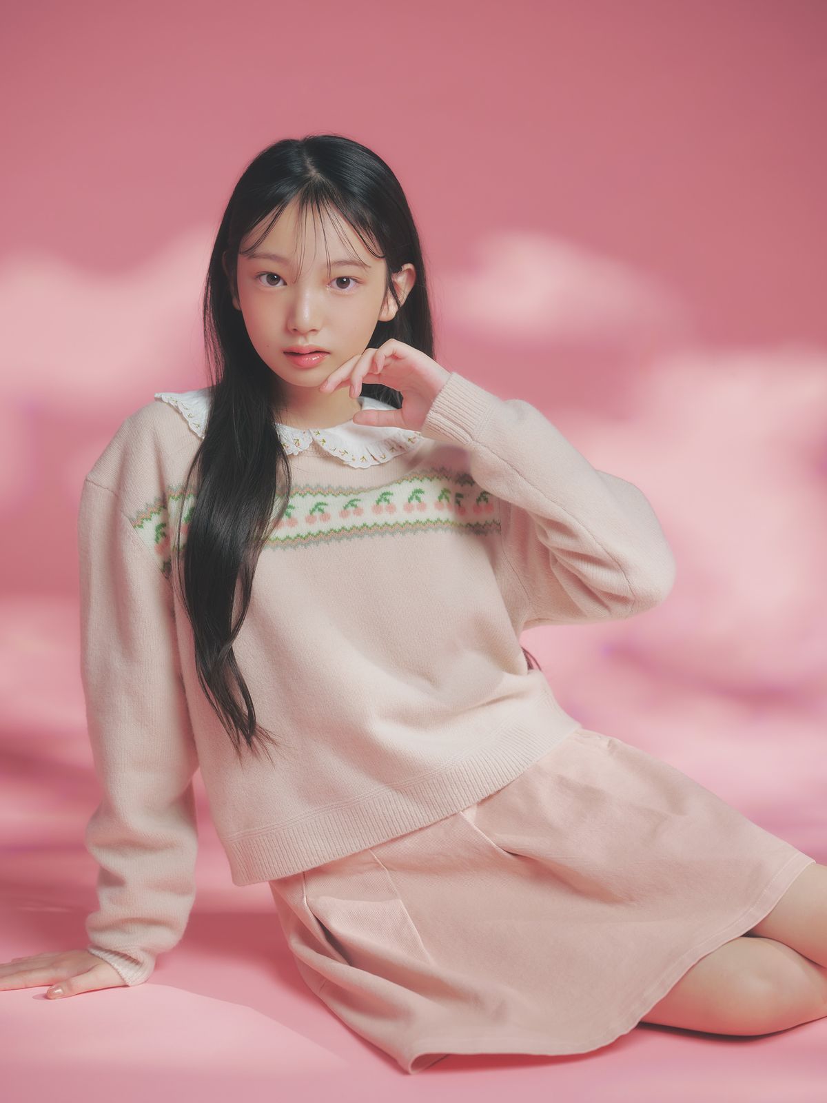 やさしいピンクで全身をつつんだ、ナチュラルルックが最上級におしゃれ。ニットとブラウスをレイヤードして、白のさし色もかんぺき。