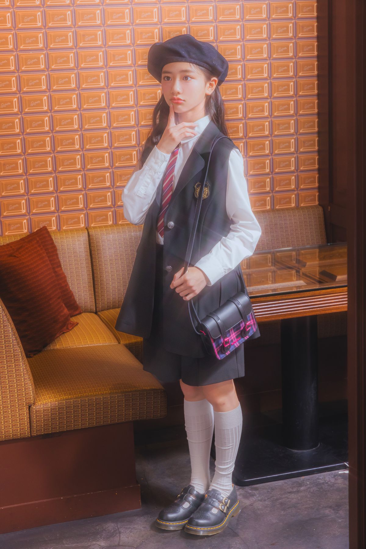 ジレとネクタイで遊んで、プレッピーな英国風ガールになりきり☆ 全体をモノトーンでまとめて落ち着いた印象に。ちひな☆ジレ×パンツ×シャツ×ネクタイ×エンブレムバッジ5点セット¥32890/ ポンポネット ジュニア ベレー帽¥5500/ ニューエラ バッグ¥17600、メリージェーンシューズ¥27500/ ともにドクターマーチン ソックス¥1540/ 靴下屋(タビオ)